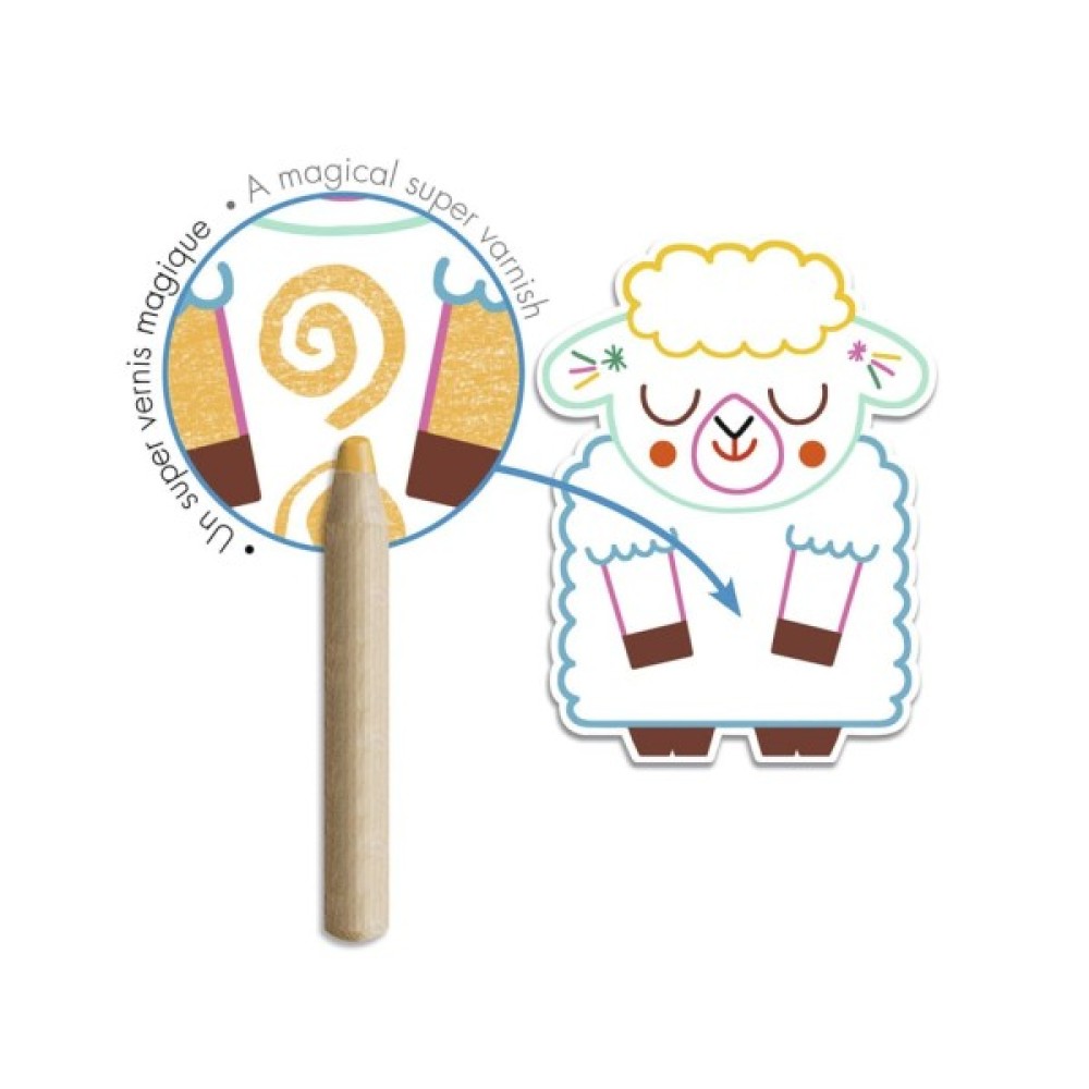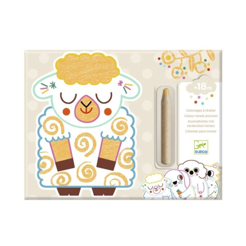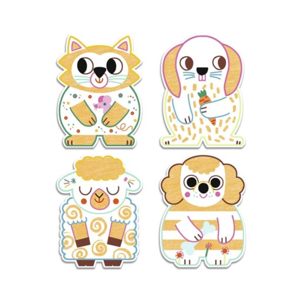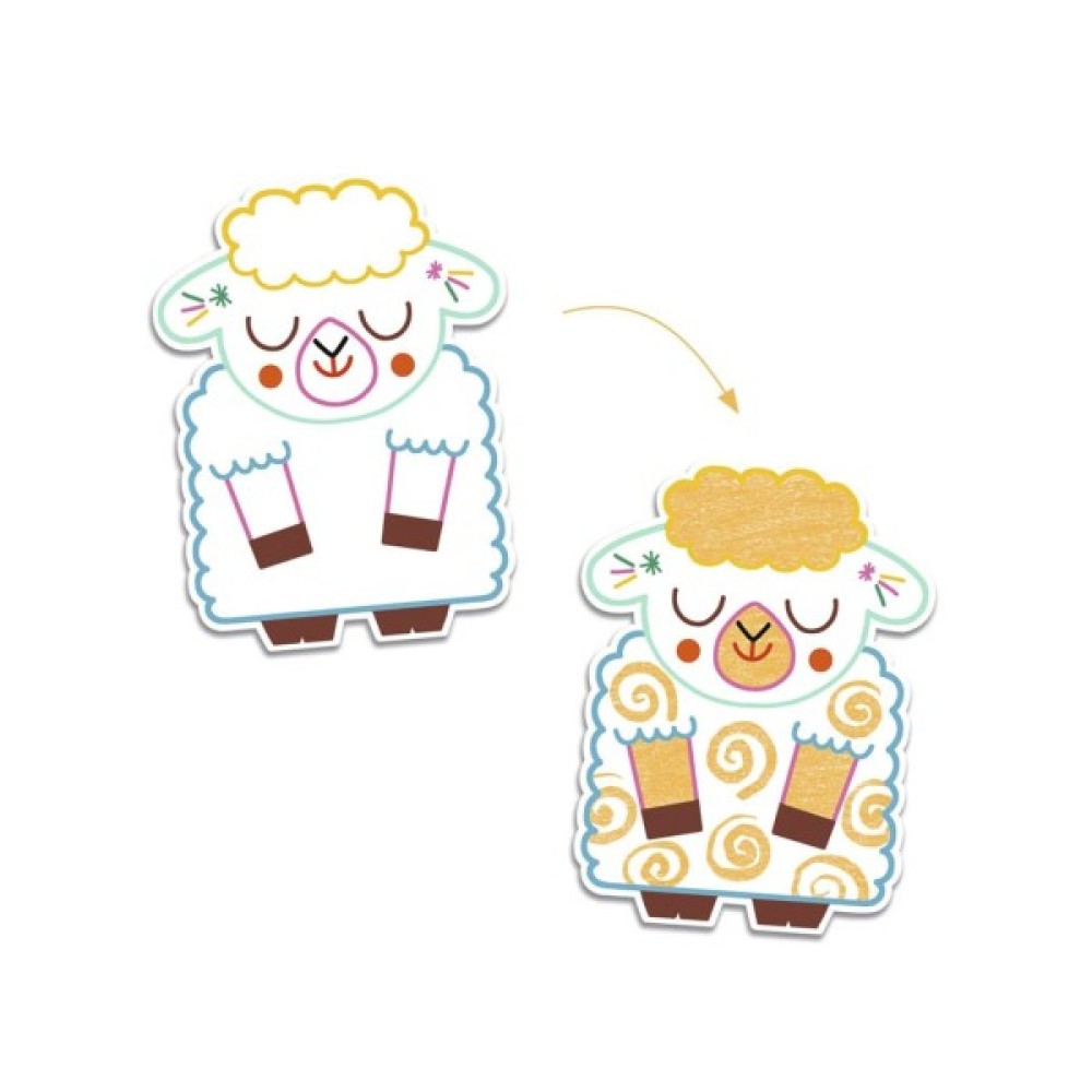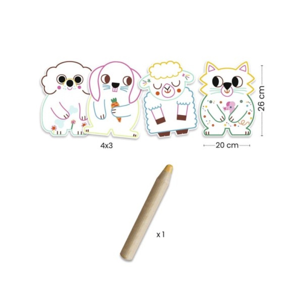 У наборі 12 трафаретів для фарбування товстим олівцем, що ідеально підходить для маленьких дитячих ручок. Картинки у вигляді тварин приховують спеціальні поля, які потрібно розкрити за допомогою крейди.