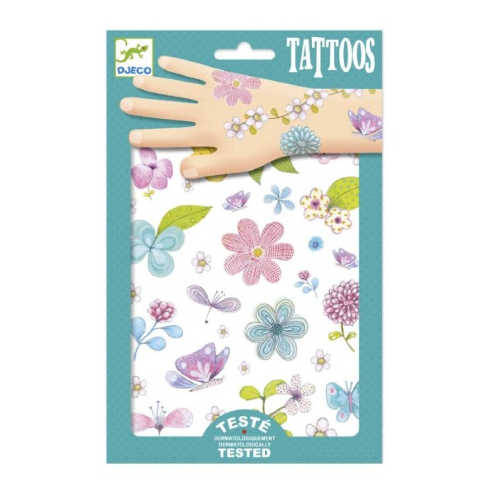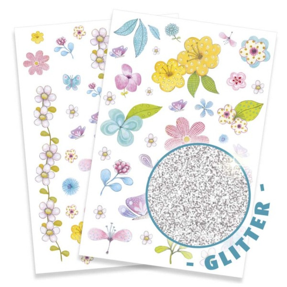 Два аркуші тимчасових татуювань із елегантним квітковим орнаментом. Дітям сподобаються ці мерехтливі татуювання! Їх попередньо нарізають, щоб зробити їх зручними у використанні, і переносять, використовуючи невелику кількість води. Дерматологічно протестований.