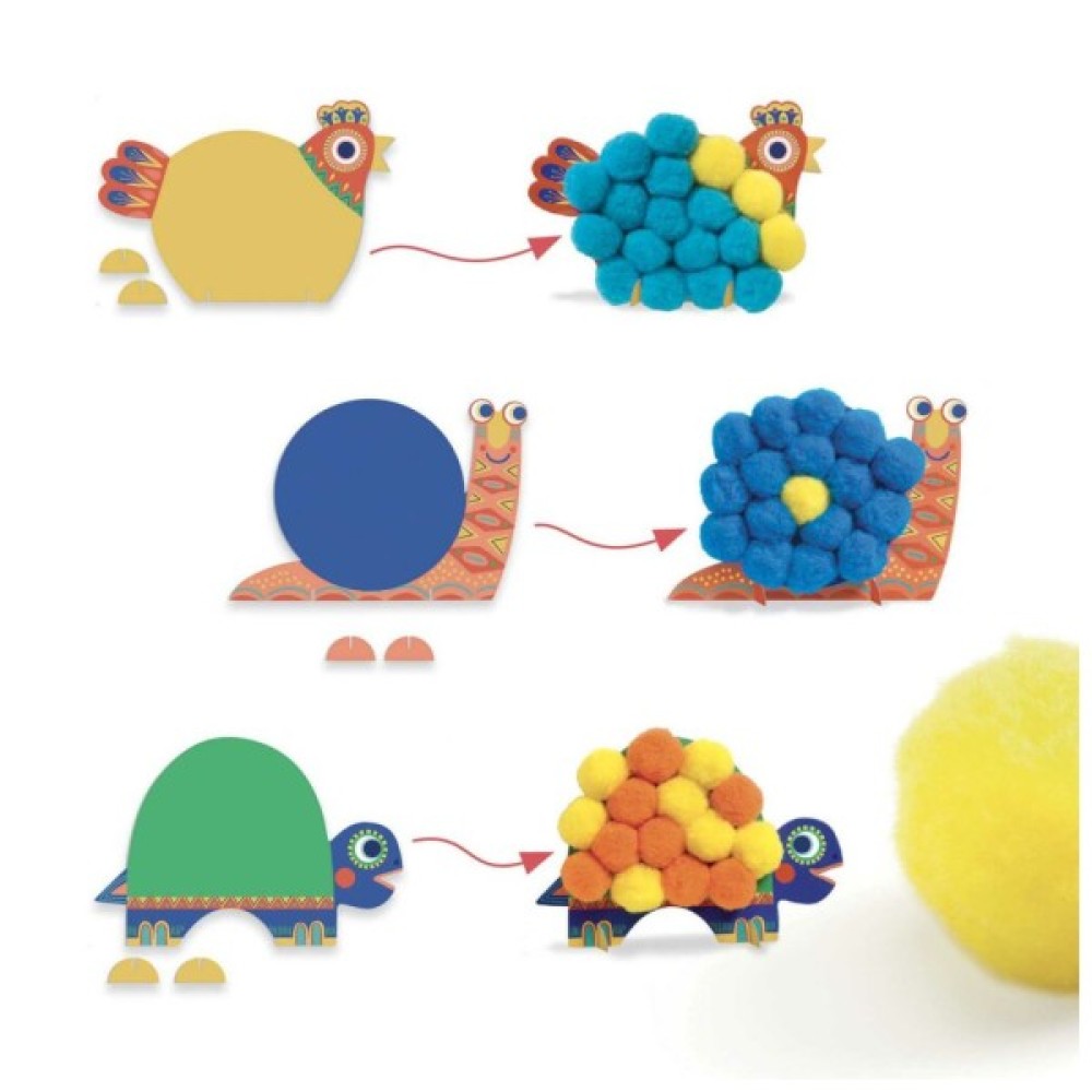 З Набором для творчості Djeco Пухнасті тварини малюки зможуть відчути себе справжніми дизайнерами декораторами. Хлопчикам і дівчаткам належить зробити аплікацію, але без клею, що особливо порадує батьків. Комплектація: 3 картки у формі тварини з самоклеючою секцією (черепашка, равлик, курочка); 50 великих різнокольорових помпонів (діаметр 4 см); 6 підставок для утримання тварин вертикально; 1 пояснювальний буклет. Головна перевага комплекту в тому, що дошки самоклеючі. Легким рухом малюки зможуть кріпити помпони на клейку основу тваринки. Набір для творчості «Пухнасті тварини» розвиває у малят моторику рук, спритність, кмітливість, а також допомагає в освоєнні кольорів, текстур і форм. Аплікація призначена для дітей від 18 місяців.