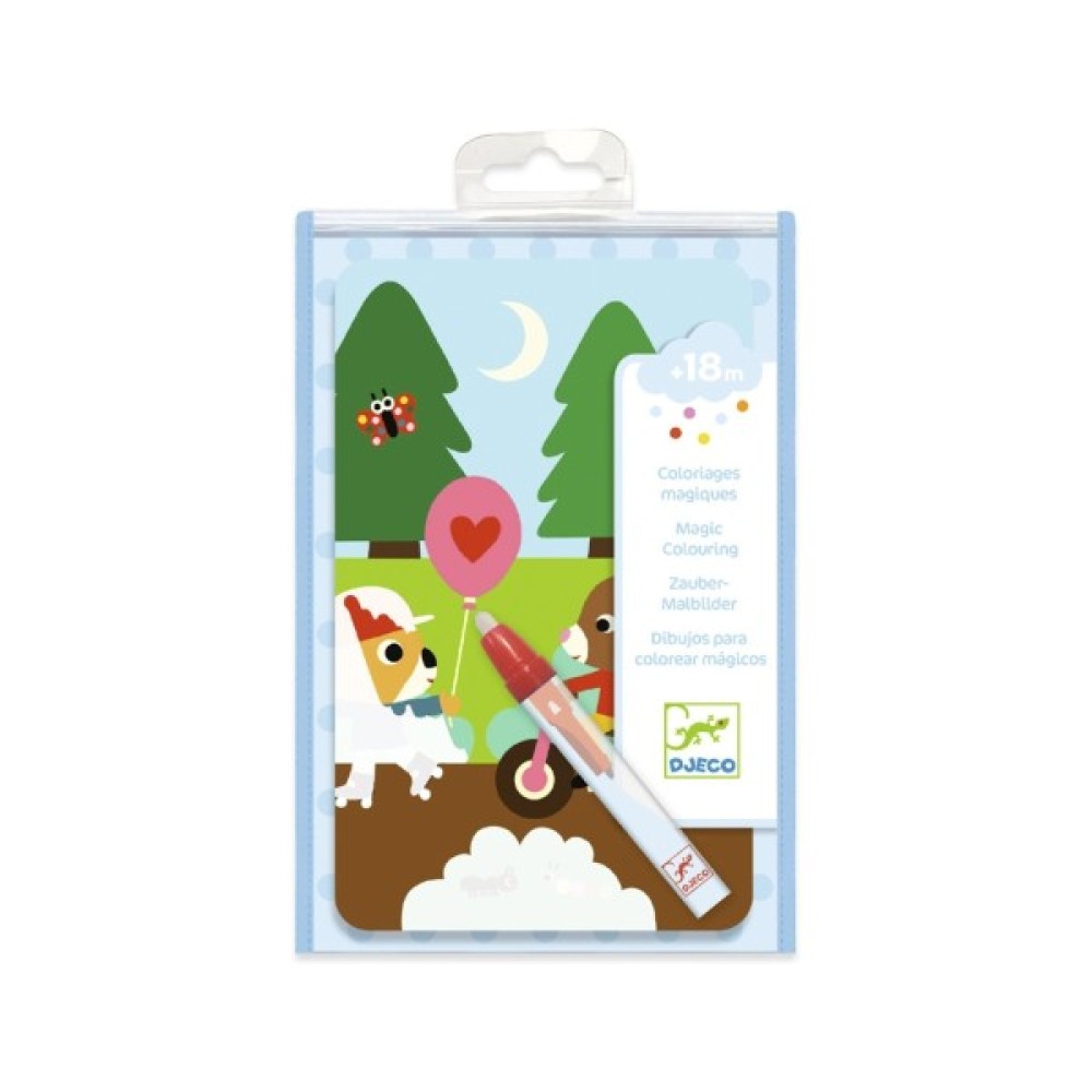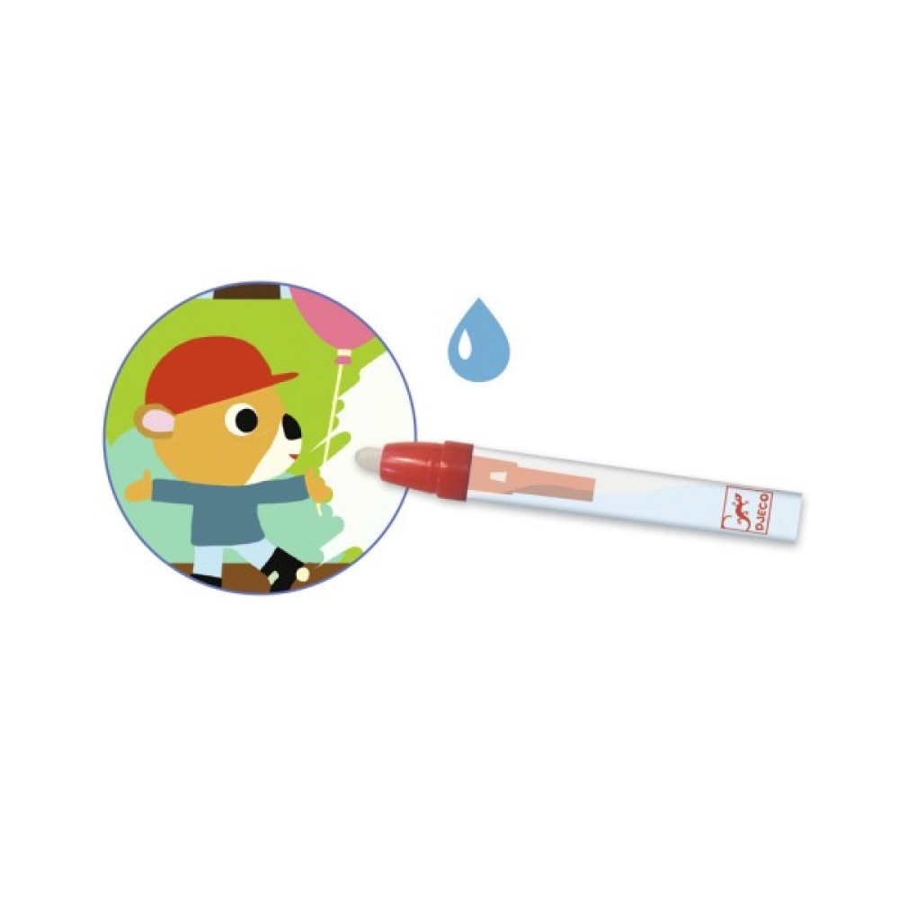 Художній комплект для малювання водою DJECO У парку це творча техніка, яка дозволяє вам малювати без використання фарб. Вам лише потрібно нанести воду на спеціальні картинки за допомогою олівця, і перед вашими очима з’явиться справжнє диво. Фарби будуть розфарбовані та оживуть, створюючи яскраві та реалістичні образи.