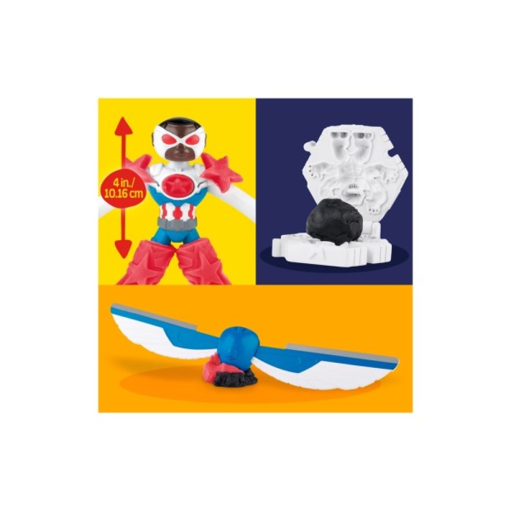 Комплектація гнучка фігурка Капітана Америки (10 см); мотоцикл Moto-Slicer; змінні крилоподібні різаки; форма-книга для створення монстрів; 3 баночки Play-Doh (загалом 85 г)
