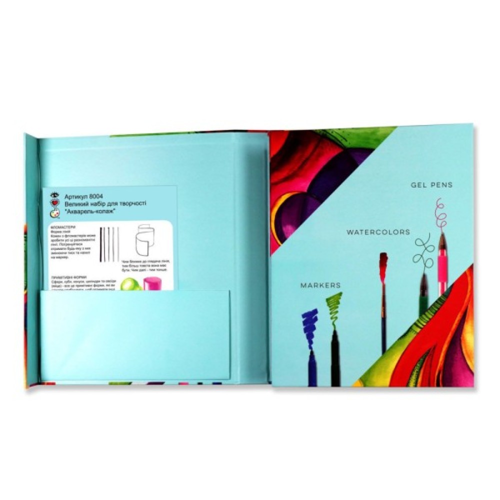 гід з техніки малювання, 12 акварельних фарб, 6 гелевих ручок, 6 маркерів, пензлик, 20 аркушів спеціального паперу