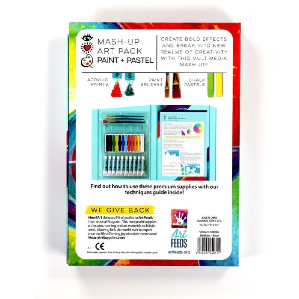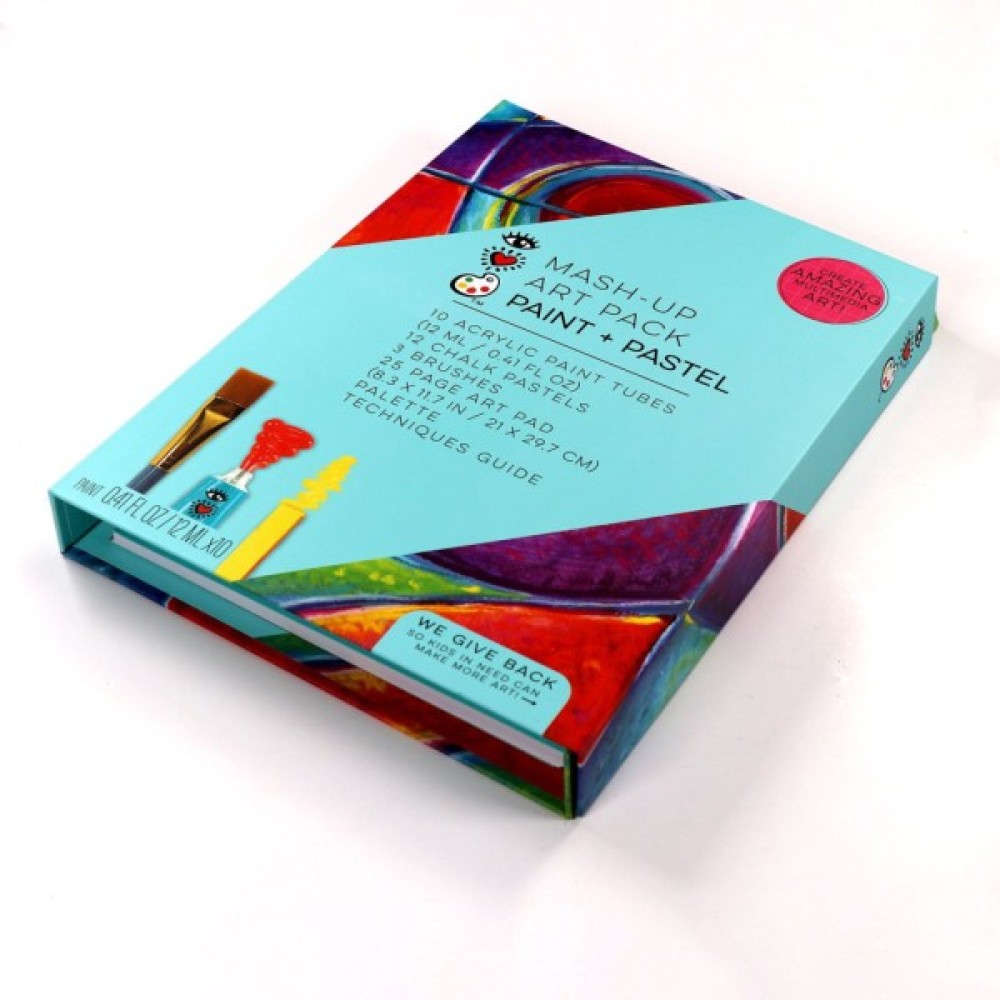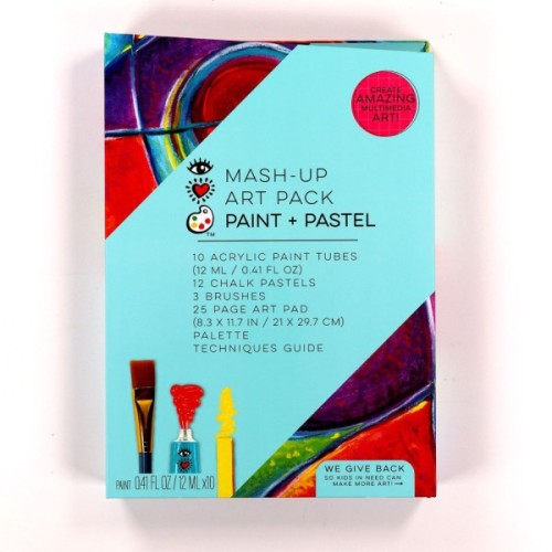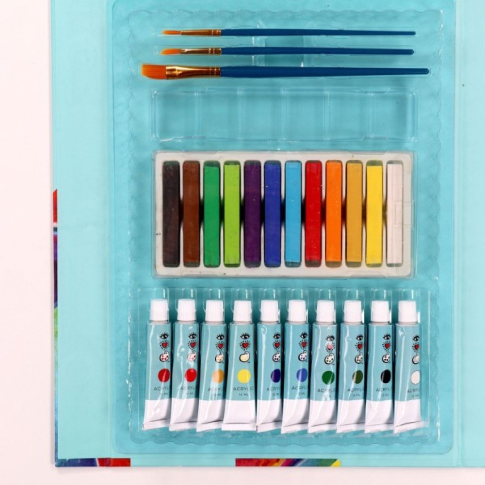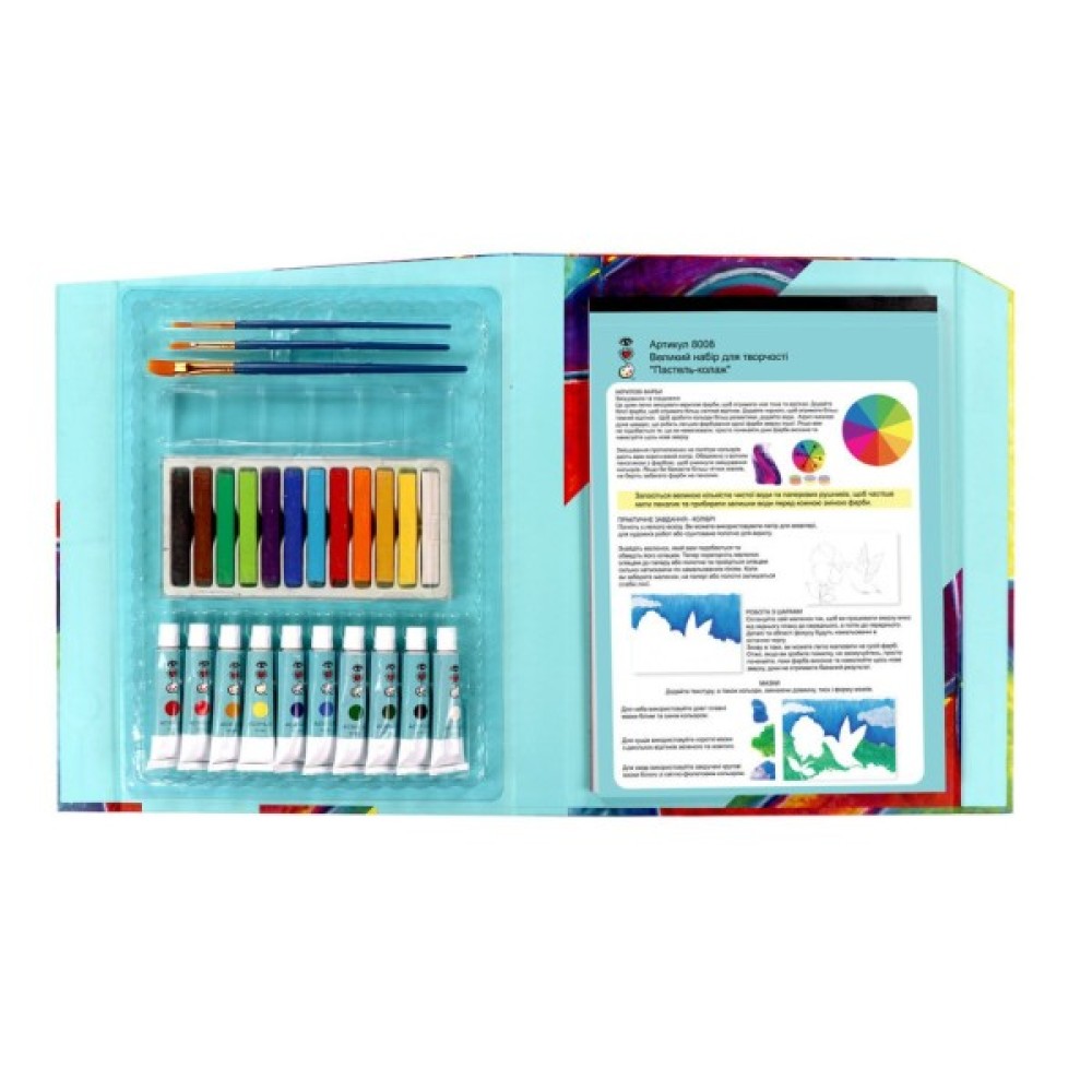 Поставляється з 10 тубиками з акриловою фарбою, 12 крейдяними пастелями, 3 пензликами, 25-сторінковою художньою подушкою, палітрою та посібником з техніки.