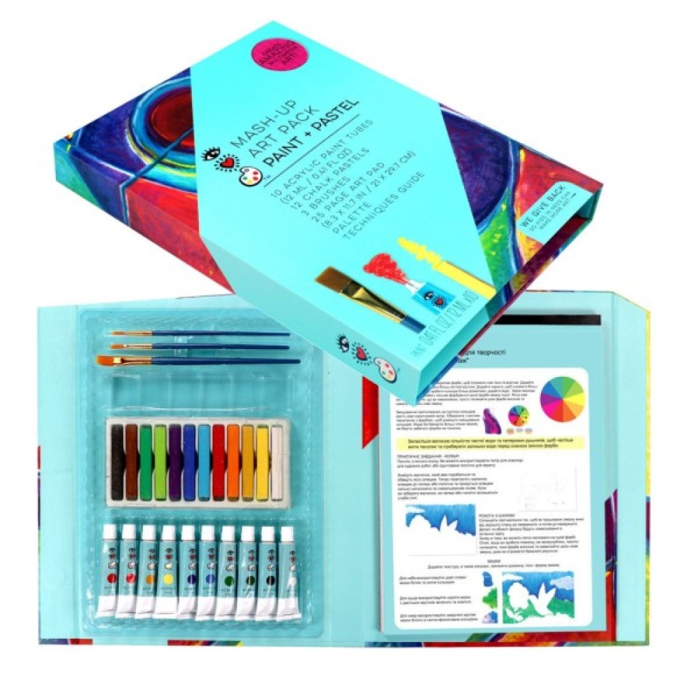 10 тубиків з акриловою фарбою, 12 крейдяних пастелей, 3 пензлики, 25 сторінок для малювання, палітра та посібник з техніки