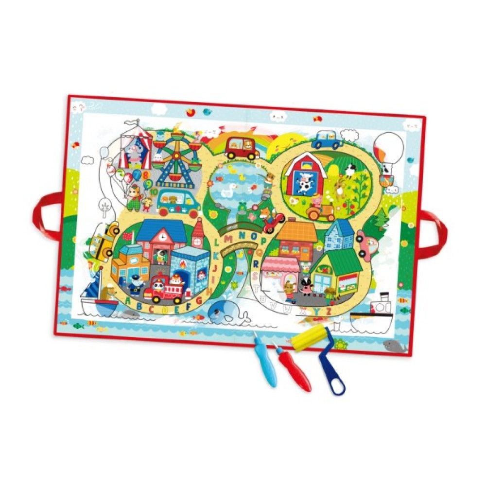 Деталізований малюнок зображує місто з усіма його атрибутами – мерія, поліція, пожежна станція, магазини, домівки мешканців, ферма та, навіть, парк розваг!