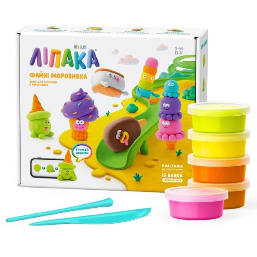 Меганабір пластиліну, що самостійно твердіє, ЛІПАКА – ФАЙНІ МОРОЗИВКА – розважить і малюків і дорослих. За допомогою анімаційних інструкцій в додатку HEY CLAY, Ви зможете зліпити 6 унікальних персонажів: Торнадика, Тепльодика, Кульконавтів, Єті Сендвіч, Ріжок Кувирок і Чоко Бро. Пластилін твердіє на повітрі протягом 24 годин, після чого можна гратися створеними фігурками.