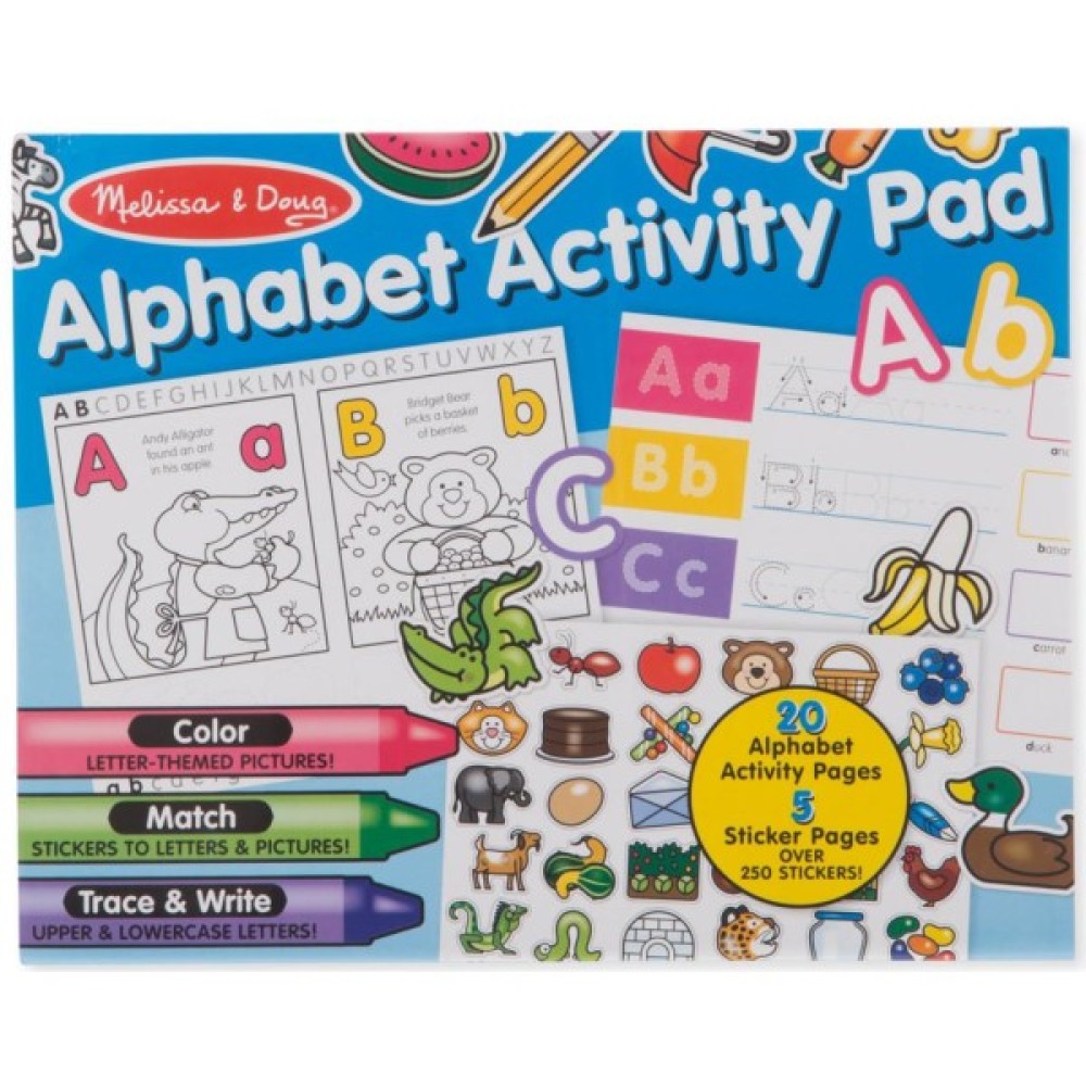 Альбом розмальовок / наліпок "Алфавіт" складається з понад 250 наклейок і 20 сторінок алфавітних вправ для дітей у віці від 4 до 5 років. Діти зможуть розфарбувати картинки з буквами, зіставити наклейки з буквами і картинками, а також вивчити англійський алфавіт, навчитися писати великі та малі літери. Можна використовувати кольорові олівці, фломастери або маркери.