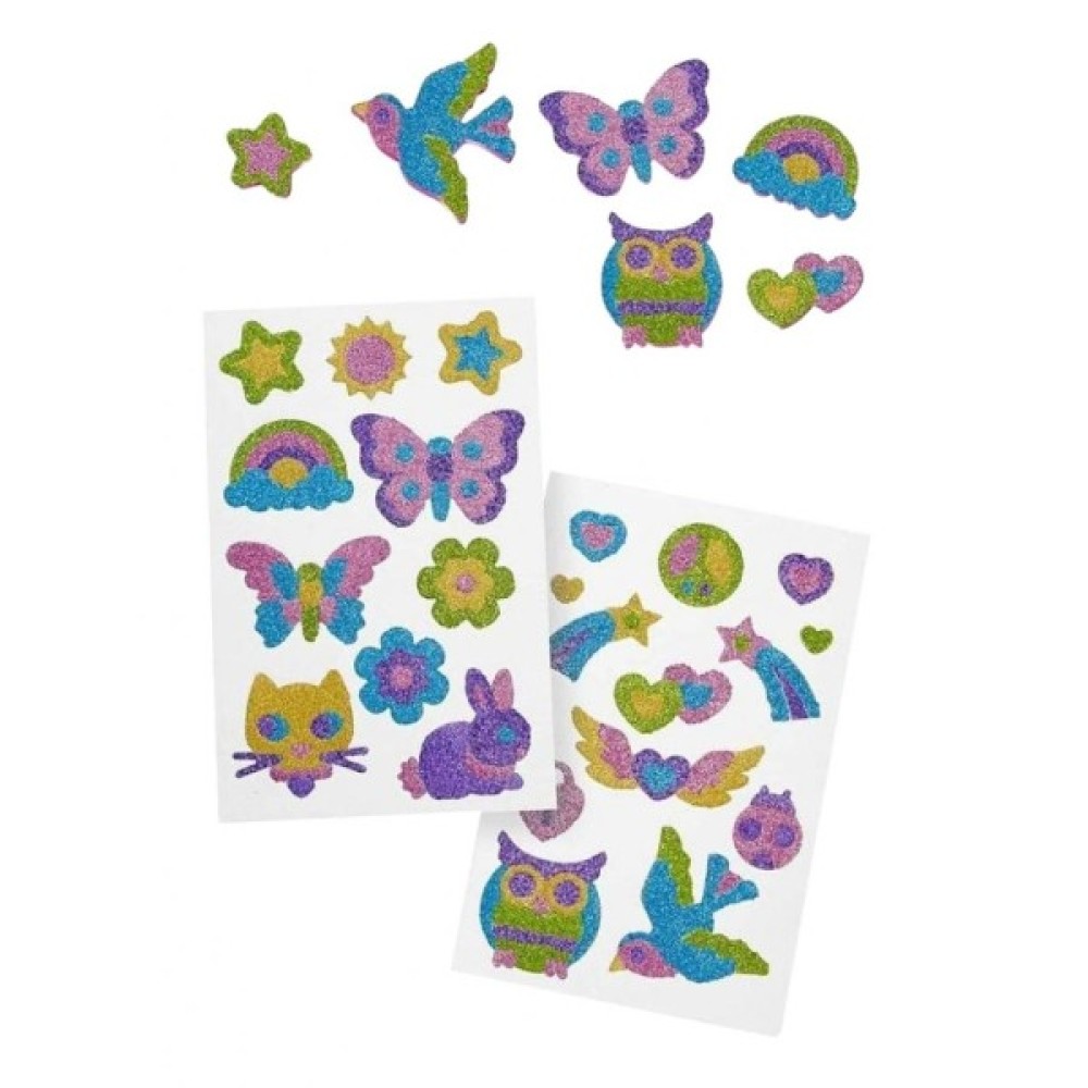 У комплект входить 5 аркушів з різнобарвним блиском і 23 об'ємних стікери: метелики, тварини, квіточки, веселка, пташки, комахи. Одна сторона стікера має клейову основу, інша має наклейки за формою фігур, процес дуже простий, але дивовижний, беремо один стікер, знімаємо з нього одну наклейку, під нею буде клейова основа, потім прикладаємо на це місце аркуш з блиском, і притискаємо трохи, потім знімаємо іншу наклейку з цієї ж фігури - прикладаємо інший аркуш з блиском, і так робимо до кінця.