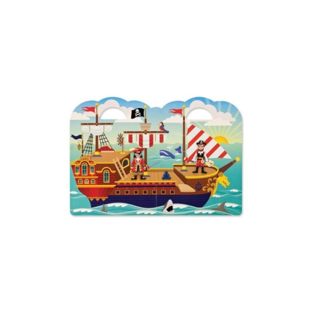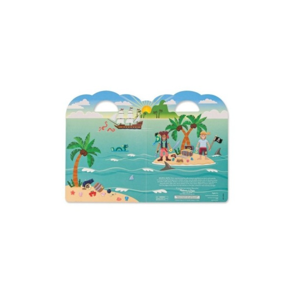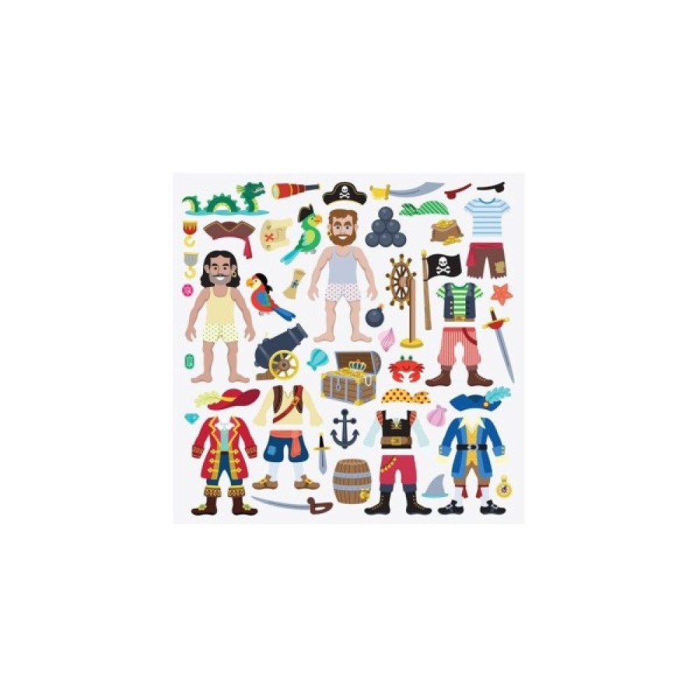Цей чудовий набір включає в себе чотири глянцевих фонових картинки, а також 51 об'ємних багаторазових наклейок. Головними героями є пірати, їх потрібно одягнути, взути і розташувати по своїх місцях, на кораблі, на острові, наклейки можна клеїти, знімати, переставляти знову і знову. Ваша дитина зможе проявити всі свої творчі здібності.