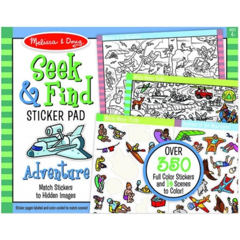 Цей набір наклейок від Melissa & Doug - це гра-пошук, розфарбовка і наклейки - все в одному! Підберіть понад 400 повнокольорових наклейок до прихованих об'єктів на 14 сторінках із зображеннями, присвячених подорожам і пригодам, а потім розфарбуйте маркерами або олівцями для створення унікальних картинок. Сторінки з наклейками мають кольорове маркування та позначені для відповідності зображень. На картинках зображені такі теми: зимовий день, океан, сафарі, гори, корабельні аварії, космос, піратський корабель, замок, джунглі, бездоріжжя, іподром, пляж, дикий захід і річкові пороги. Перфоровані краї дозволяють легко видаляти сторінки з наклейками.