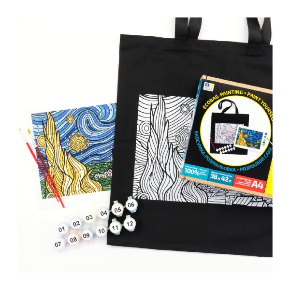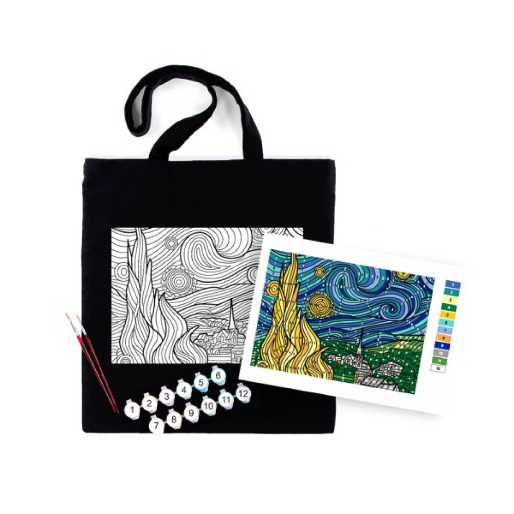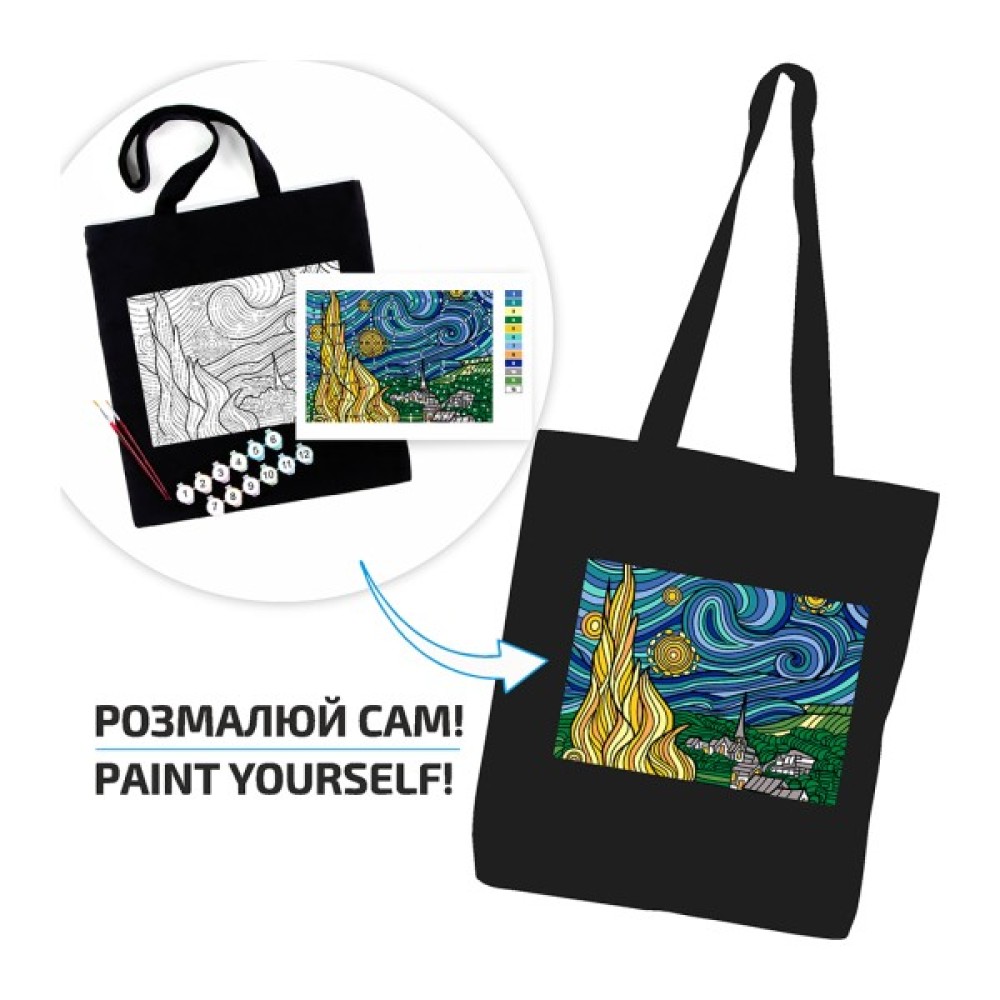 Втіль у життя власну версію знаменитої «Зоряної ночі» з набором екосумка-розмальовка від ROSA Talent! Це не просто стильна чорна сумка — це полотно для творчості, де кожен штрих фарби стає частиною твого настрою та самовираження.