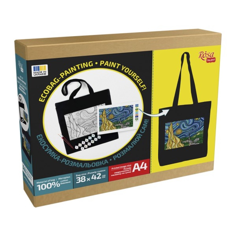 - Комплектація: екосумка, фарби акрилові для тканин ROSA Talent, якісні художні пензлі, кольорова схема, прозорий пакет, етикетка з покроковою інструкцією на звороті