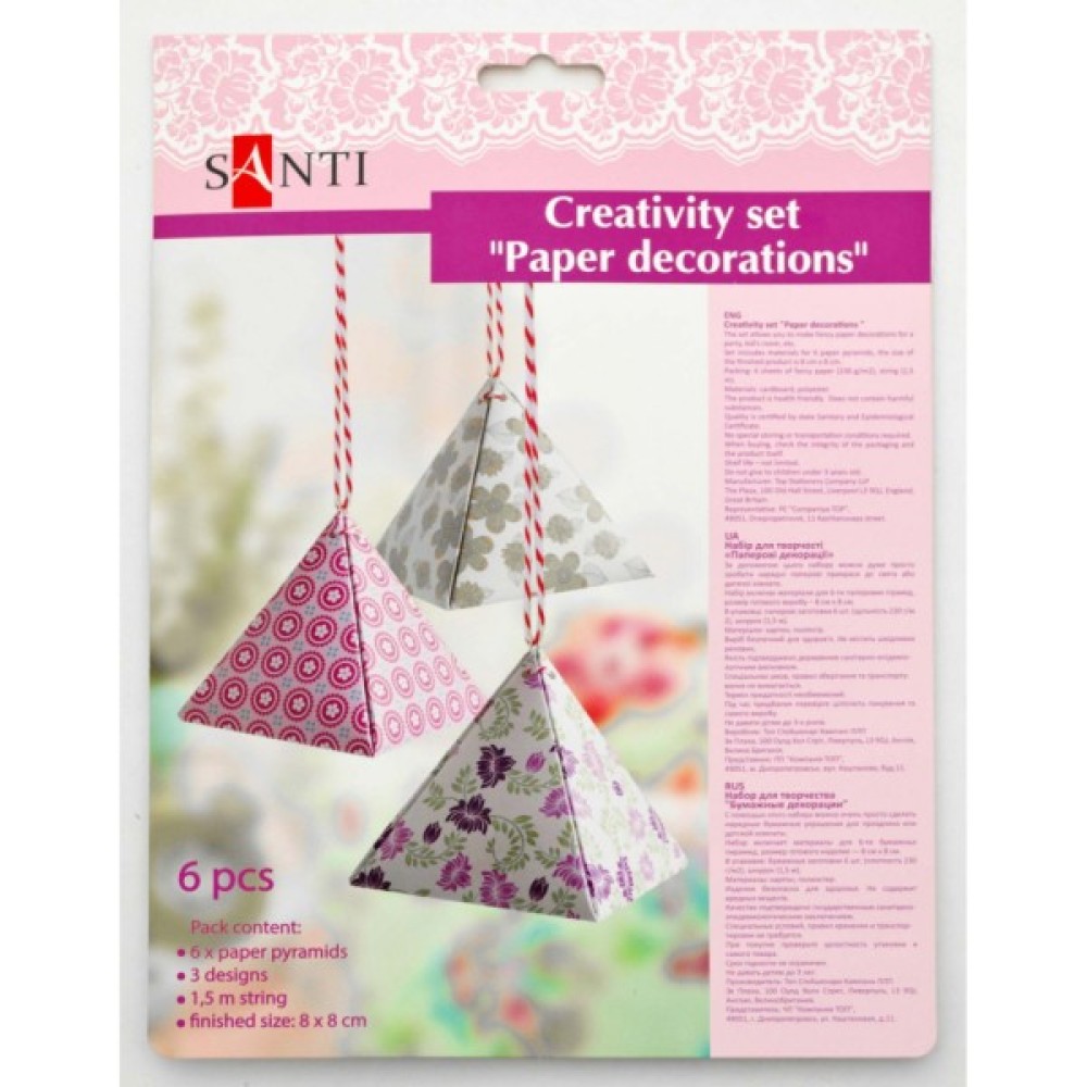 Набір включає матеріали для 6-ти паперових пірамід (щільність 230 г / м2), шнурок 1,5 м. Розмір готового виробу - 8 х 8 см.