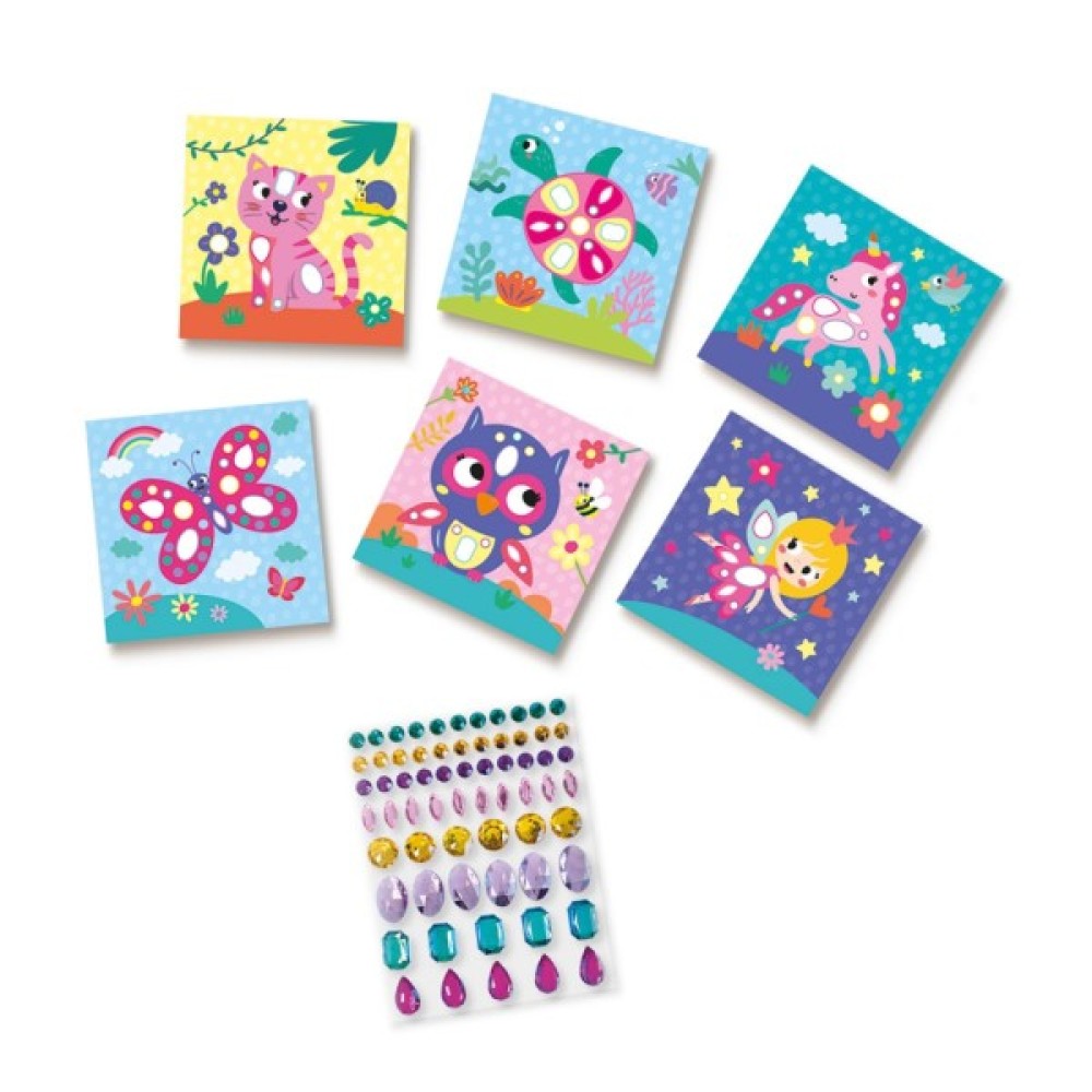 6 ілюстрованих карток для аплікації; 65 великих самоклеючих стразів різних форм і кольорів