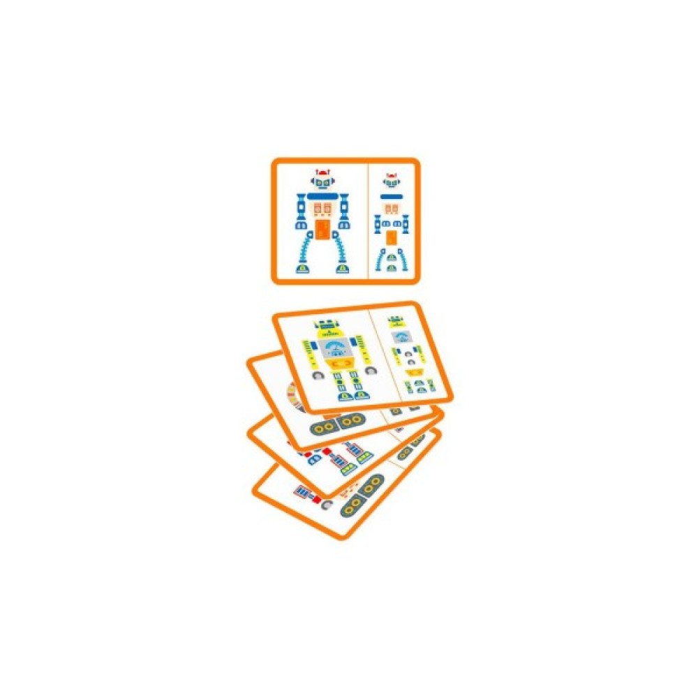 В ігровий набір Робот входять: 5 карток із прикладами 10 різних роботів, 45 складових дерев’яних елементів для їх створення, коркова дошка, молоток, упаковка безпечних гвіздків.