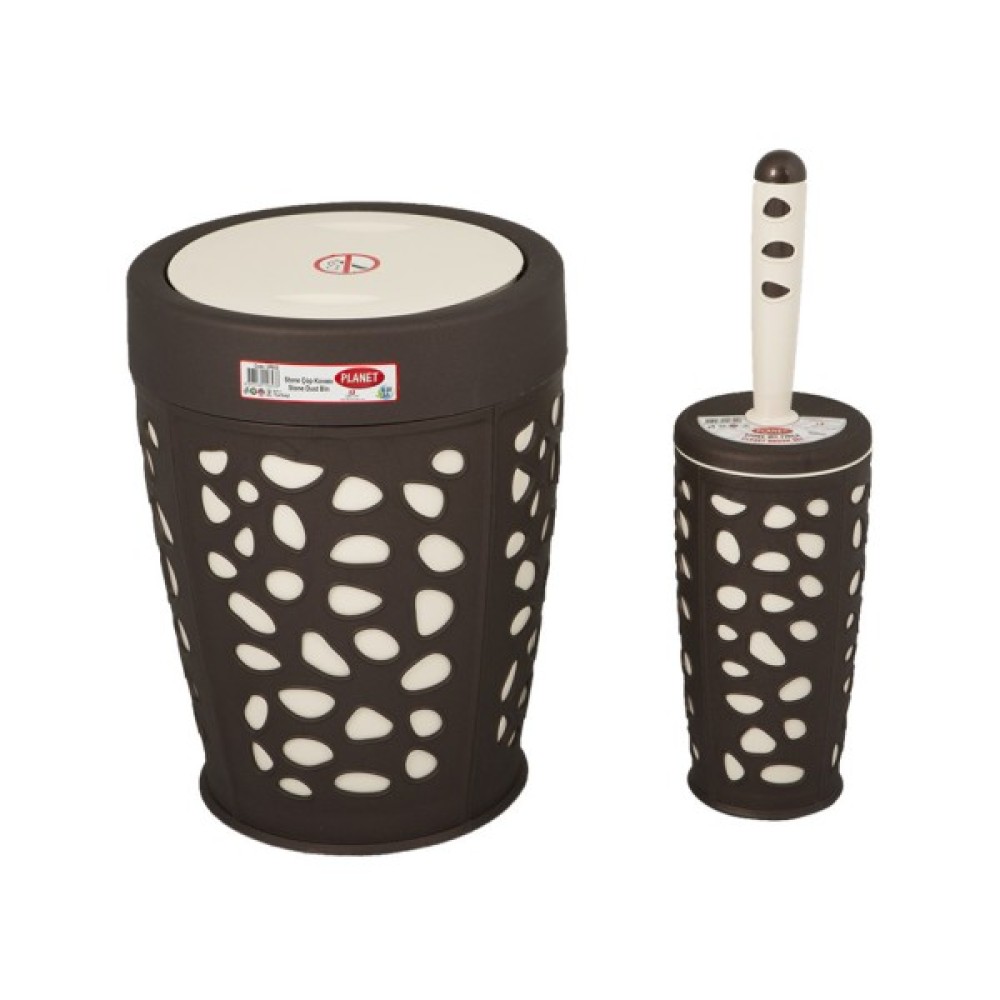 Лінійка наборів для ванної кімнати STONE має сучасний дизайн в поєднанні з функціональністю і практичністю. Особливістю даної моделі є рельєфний малюнок з переплетенням двох виробів. Палітра кольорів дає можливість підібрати набір під будь-який інтер'єр. Набір складається з двох предметів: щітка для туалету і корзина для сміття з поворотною кришкою, за допомогою якої не видно вмісту відра, що допоможе вам зробити ванну ще більш естетичною. У йоржика використана ліва різьба (при з'єднанні йоржа з ручкою, потрібно обертати йорж проти годинникової стрілки). Вироби зроблять вашу ванну більш затишною і різноманітною. Товар виготовлений з міцного пластику.