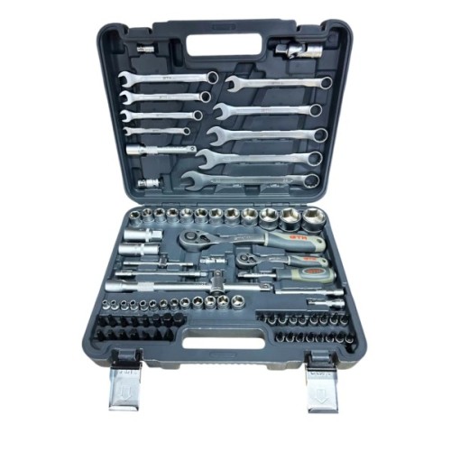 В арсеналі GTM 82 шт. ви знайдете все необхідне для автомобільного ремонту та технічного обслуговування. Комплектація включає 82 інструменти: комбіновані гайкові ключі (9 шт) з розмірами 8-22 мм, 44 метричні торцеві головки з шестигранним профілем та різними вставками, такими як T, SL, Hex, PZ, PH. Особливо зручною є наявність тріскачки з механізмом на 72 зубці, яка забезпечує точне налаштування моменту навіть у важкодоступних місцях, а ергономічна двокомпонентна рукоятка робить роботу комфортною та запобігає ковзанню.