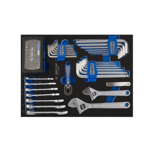 гайкові ключі; біти; шестигранні/зіркоподібні ключі; тримач для біт; тріскачка; щуп для вимірювання зазорів; розвідний ключ