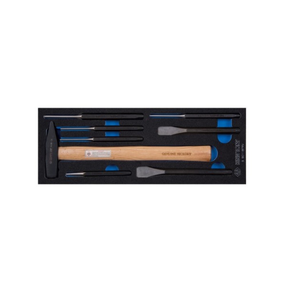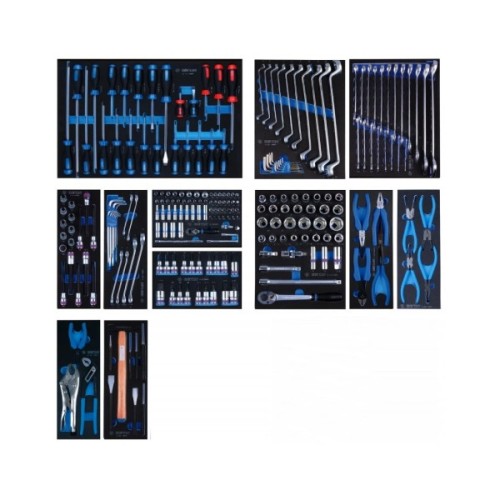 Комплектація набору шарнірно-губцевий інструмент; викрутки; торцеві головки; інструменти для роботи з торцевими головками; гайкові ключі; біти; шестигранні/зіркоподібні ключі; молоток; тримач для біт; тріскачка; подовжувач; вороток; зубило; пасатижі; бокорізи; гострогубці; кардан шарнірний; знімач стопорних кілець; переставні кліщі; кліщі з фікcaтopoм; довгогубці; вибивачки