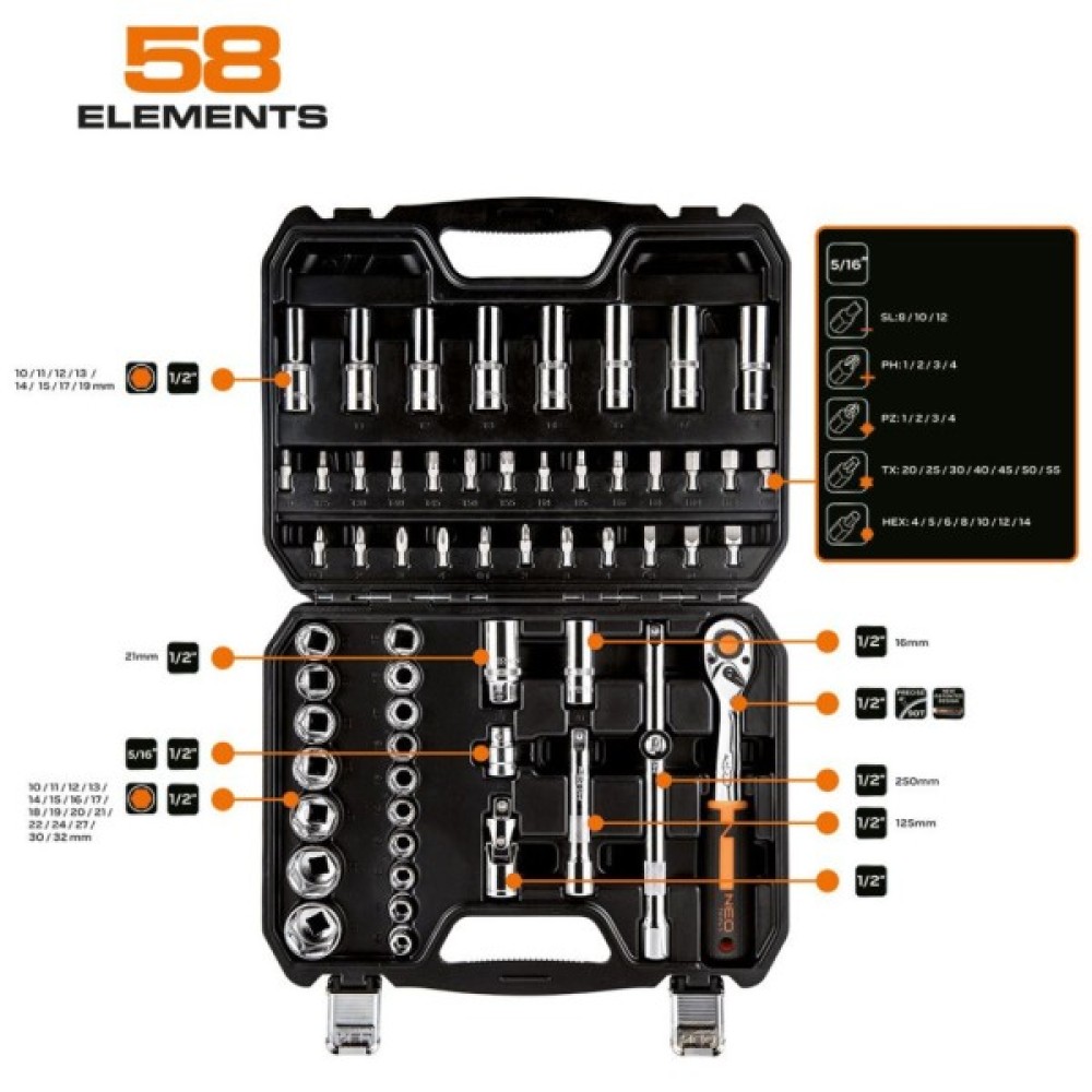 Набір інструментів Neo Tools 58шт, 1/2", CrV, кейс (10-042)
