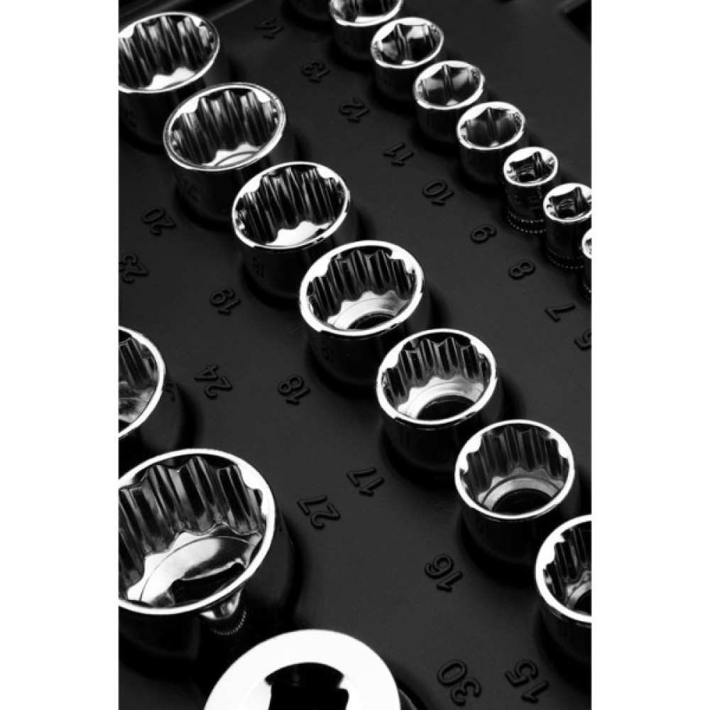 В комплекті присутні всі необхідні інструменти для виконання комплексу задач: тріскачка з 90 зубцями забезпечує плавний хід і меншу амплітуду руху; подовжувачі різної довжини (1/2" на 125 мм та 250 мм, 1/4" на 50 мм та 100 мм) значно розширюють можливості доступу до важкодоступних місць. Зручний тримач для біт дозволяє швидко та просто замінювати насадки, а карданний шарнір забезпечує гнучкість у виконанні завдань під різними кутами.