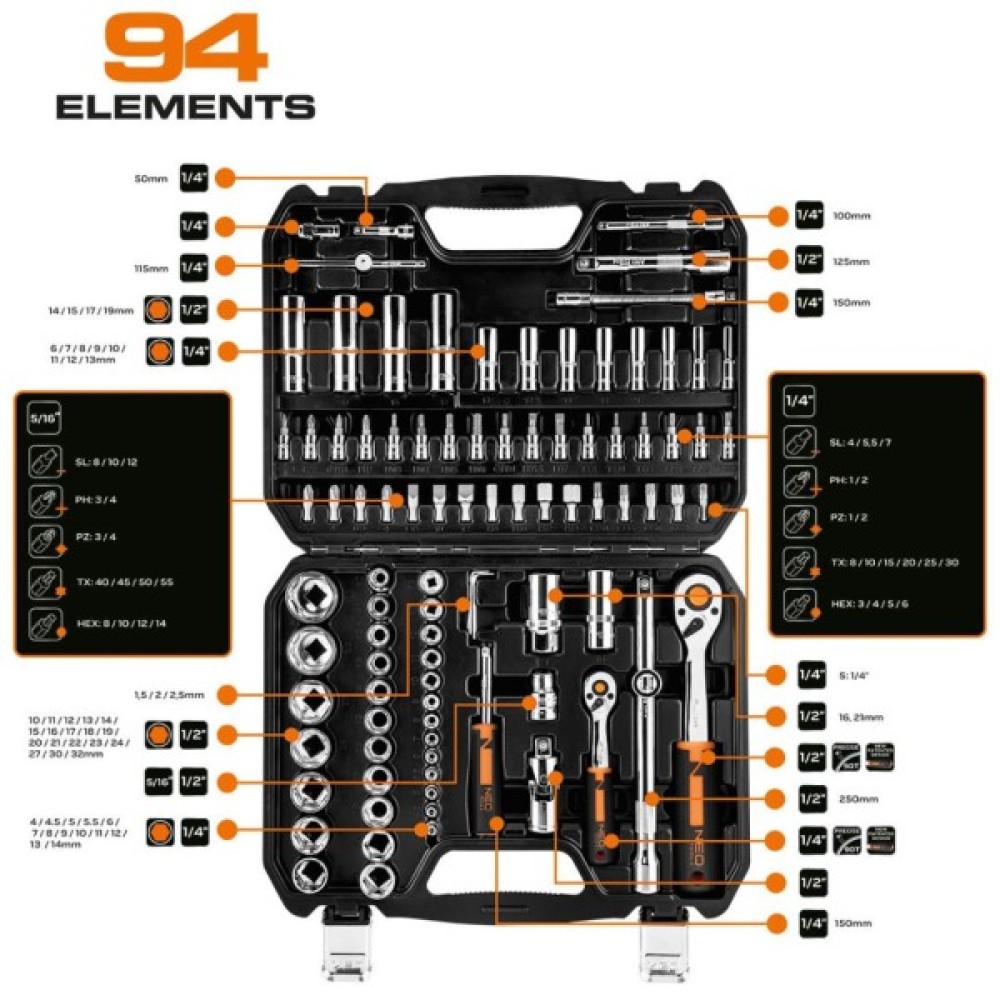 Набір інструментів Neo Tools 94 шт, 1/2", 1/4", CrV, кейс (10-062) - ідеальний вибір для будь-якого автомобільного ентузіаста або професіонала, який цінує надійність, функціональність та високу якість. Цей набір вражає своїм продуманим підбором інструментів та аксесуарів, що дозволяють виконувати широкий спектр робіт з автомобілем і не тільки.