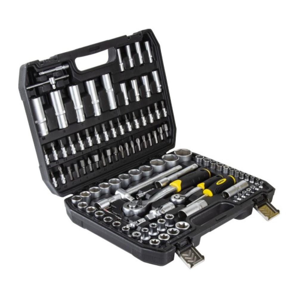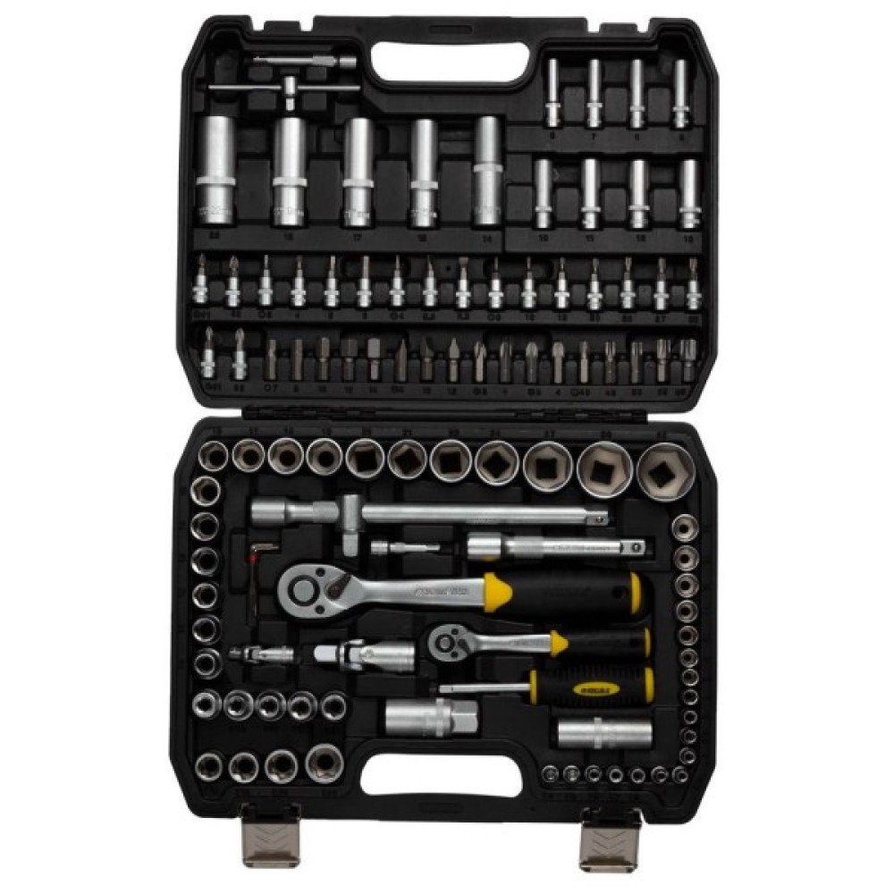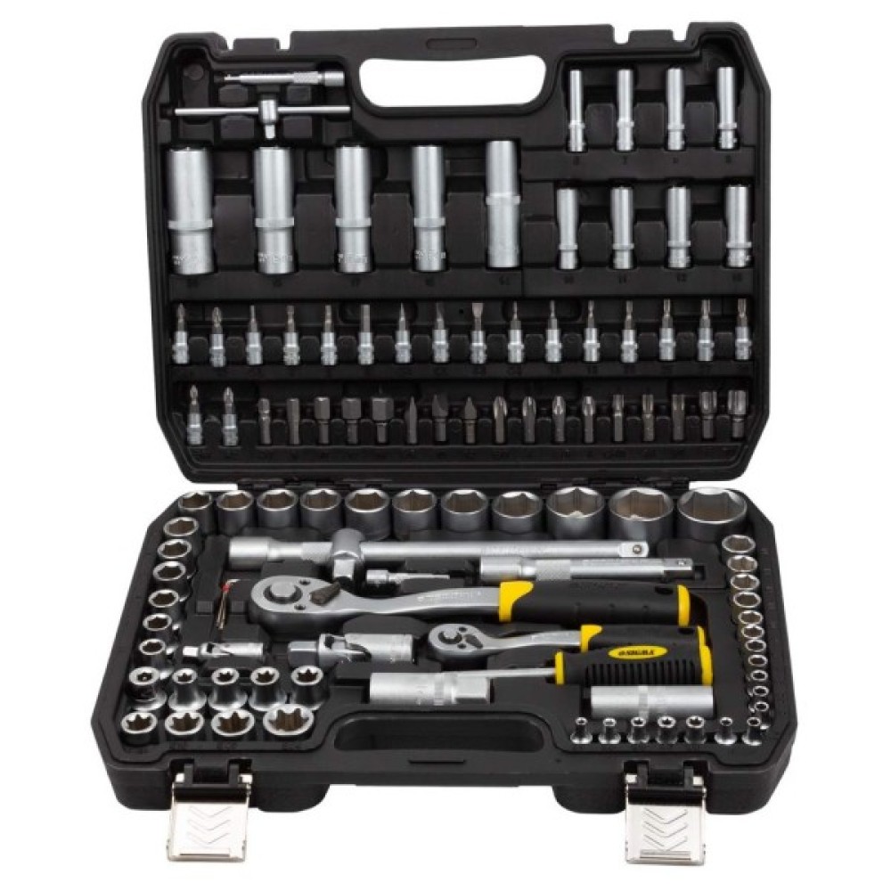 Особливу увагу в наборі приділено високій якості матеріалів та ретельній підборці елементів. Всі інструменти виготовлені зі сталі CrV (хром-ванадієва сталь), що гарантує їхню довговічність та високу стійкість до зносу і корозії. Комплектація включає 110 елементів, серед яких ви знайдете все необхідне для виконання різноманітних завдань від регулярного обслуговування до складного ремонту.