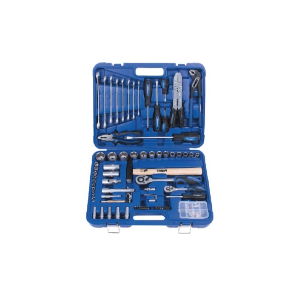 Комплектація набору шарнірно-губцевий інструмент; викрутки; торцеві головки; інструменти для роботи з торцевими головками; гайкові ключі; біти; шестигранні/зіркоподібні ключі; молоток; тримач для біт; тріскачка; подовжувач; пасатижі; кардан шарнірний; обтискний інструмент; кліщі переставні