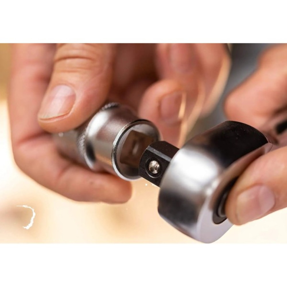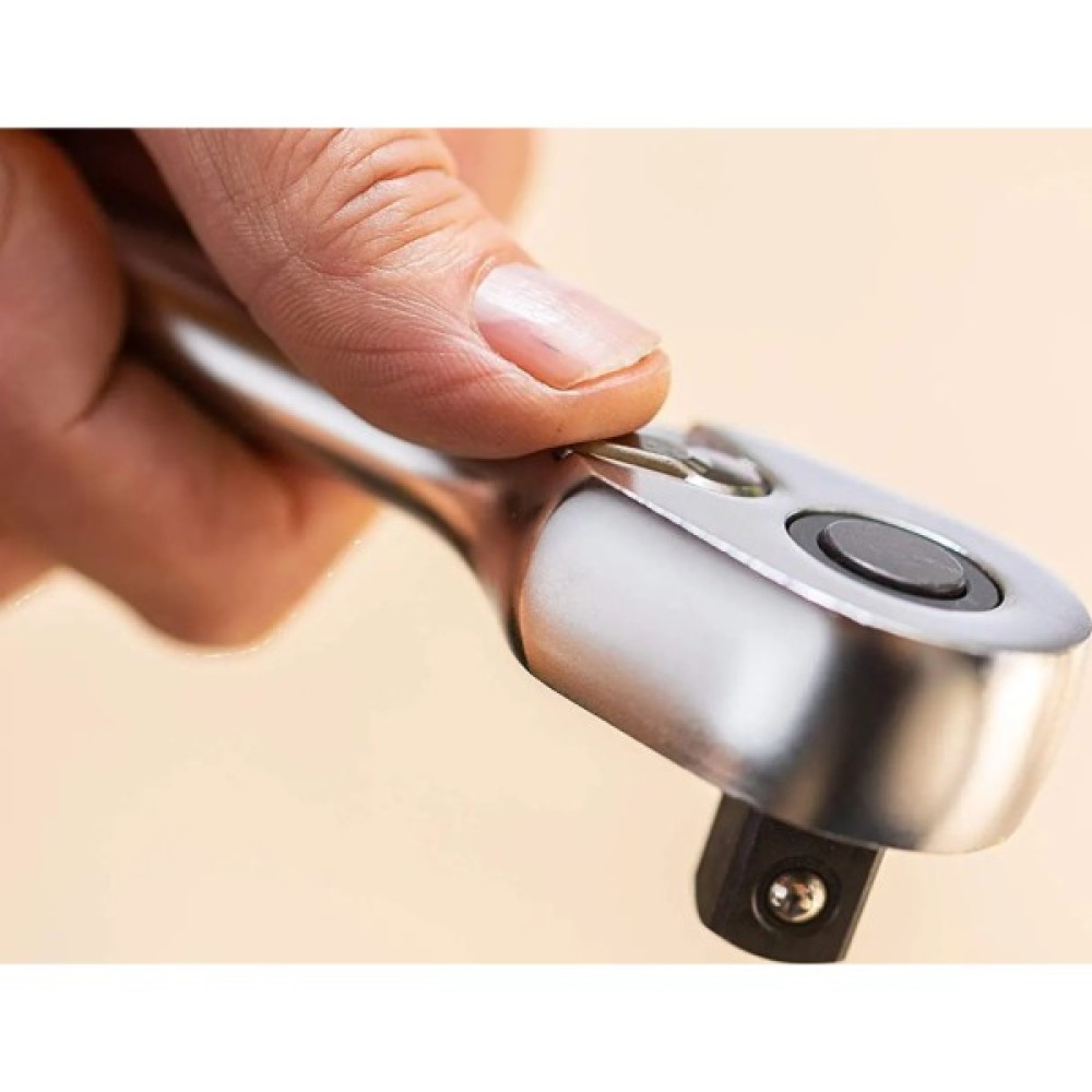 Особливість цього набору полягає в його високій якості і продуманих деталях. Інструменти мають поліроване оздоблення з лазерним маркуванням для забезпечення відмінної видимості навіть в умовах недостатнього освітлення. Ручки обладнані храповим механізмом з 120 зубцями, що надає вам підвищену точність та комфортність роботи. Важіль зміни напрямку обертання та кнопка швидкого від'єднання дозволяють ефективно переключатися між операціями, забезпечуючи швидкість та зручність роботи.