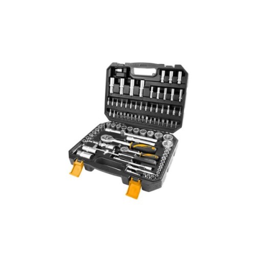 Конструкція та зручність – набір містить широкий вибір інструментів, у тому числі 62 торцеві головки різних розмірів, що дозволяють виконувати роботу з максимальною точністю. Ергономічні двокомпонентні руків’я тріскачок обладнані 72-зубцевим храповим механізмом, що гарантує плавний хід і надійну фіксацію. Це не лише підвищує комфорт під час роботи, але й істотно зменшує втому рук.