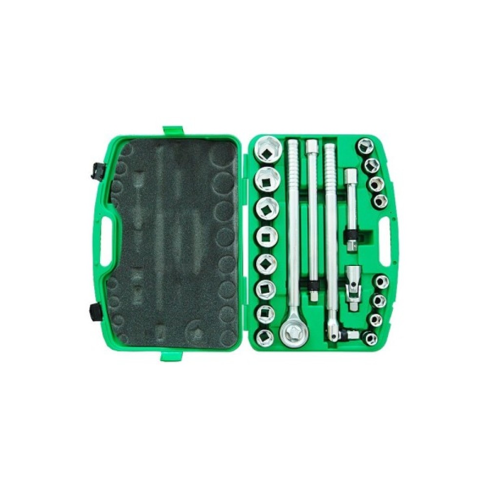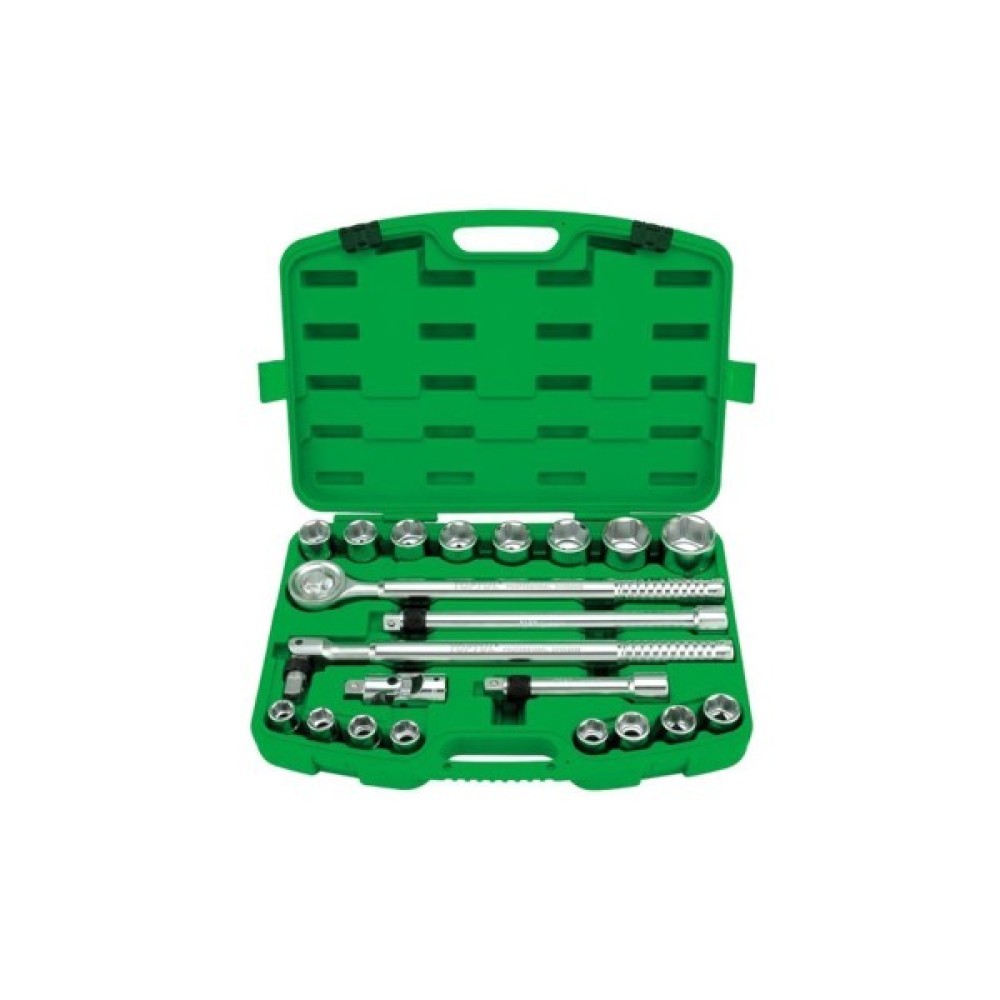 До складу набору входить 21 інструмент, що дозволяє впоратися з різноманітними завданнями автомеханіки. Зокрема, тут ви знайдете 16 торцевих головок з стандартною довжиною, які мають метричну розмірність і будуть досить зручними для використання в різних ситуаціях. Їх робочий профіль виконаний у вигляді шестигранника, що забезпечує надійне зчеплення з гайками і болтами, зменшуючи ризик прослизання під час використання. Розміри торцевих головок у наборі варіюються: від 3/4" x 19 до 3/4" x 50.