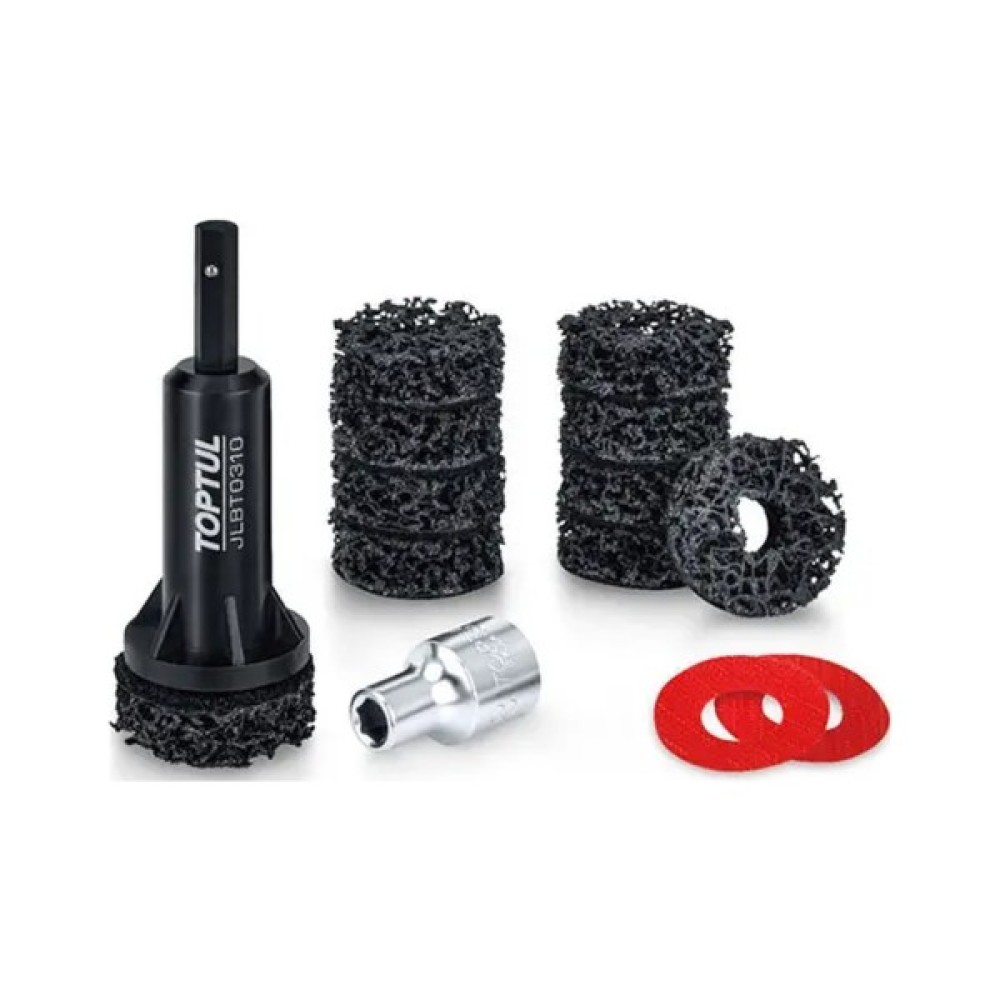 В набір входять абразивні диски, легко замінювані завдяки кріпленню на липучці, розраховані на обробку до 50 автомобілів. Комплект також оснащений адаптером для приводу 1/2", сумісним із дрилями та пневмопістолетами, забезпечуючи зручність використання. Оберіть Toptul для довговічності та безпеки на дорозі.
