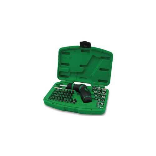 Комплект містить 54 інструменти, які допоможуть вирішити широкий спектр завдань. Основними елементами набору є тримач для біт, торцеві головки, у кількості 13 штук, та біти, яких аж 37 штук. Особливістю цього набору є тріскачкова викрутка, що забезпечує швидке та легке переключення між різними насадками, завдяки чому робота проходить значно швидше і комфортніше.