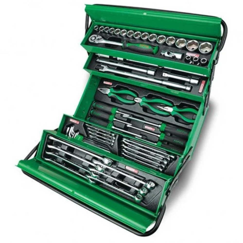 Набір інструментів Toptul у інструментальному ящику з 5 секцій є надійним компаньйоном для кожного автомобільного ентузіаста та професіонала. Цей набір, що включає 62 деталі, створений з урахуванням всіх можливих потреб, які можуть виникнути у процесі ремонту та обслуговування транспортних засобів.