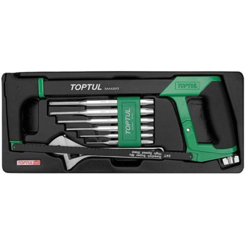 Комплектація набору включає в себе такі незамінні інструменти, як міцний вибивач, надійну ножівку та високоякісний розвідний ключ. Завдяки продуманому вибору інструментів, набір покриває більшість потреб у роботі з металами, деревом та іншими матеріалами. Розвідний ключ, представлений у комплекті, дозволяє швидко та точно налаштовувати розмір, що є ідеальним для різного типу кріплень.