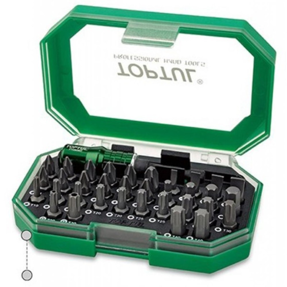 Набір включає 35 біт, що гарантує максимальну точність та варіативність робіт. Ці біти, у комплекті з тримачем для біт, забезпечують ідеальну фіксацію та міцність з'єднання, що особливо важливо під час роботи на високих обертах. Це надає безпеку та захист від викривлення при тривалій експлуатації.