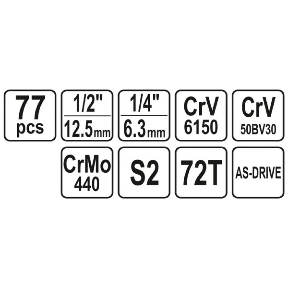 Розміри воротків 1/2": кардан; 1/4": кардан; 1/2": трещіточний 255 мм; 1/4": трещіточний 155 мм