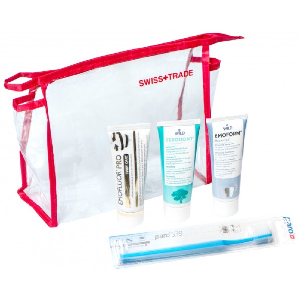 Комплектація набору EMOFORM Діамант Зубна паста, 75 мл; TEBODONT Зубна паста з олією чайного дерева (Melaleuca Alternifolia), без фториду, 75 мл; EMOFLUOR Подвійний догляд Зубна паста, 75 мл; paro S39 Зубна щітка, м'яка