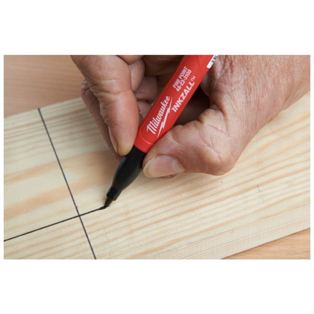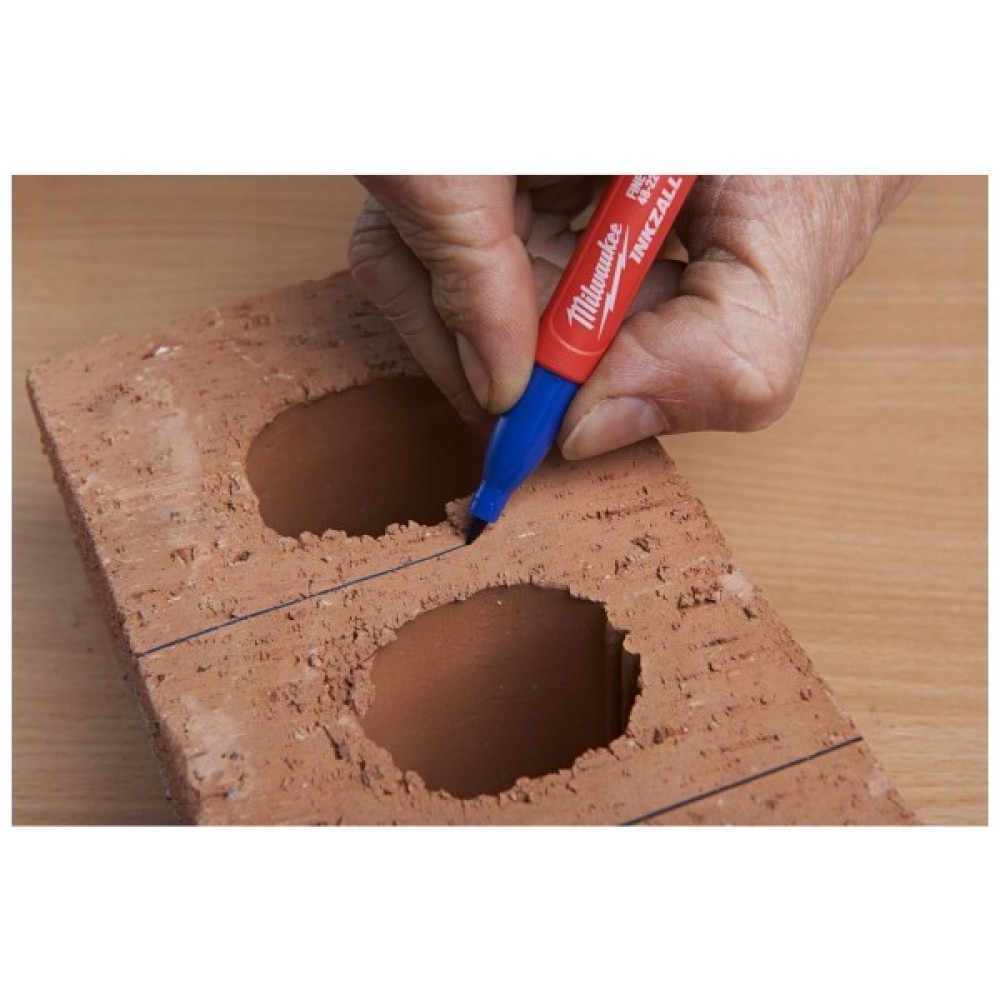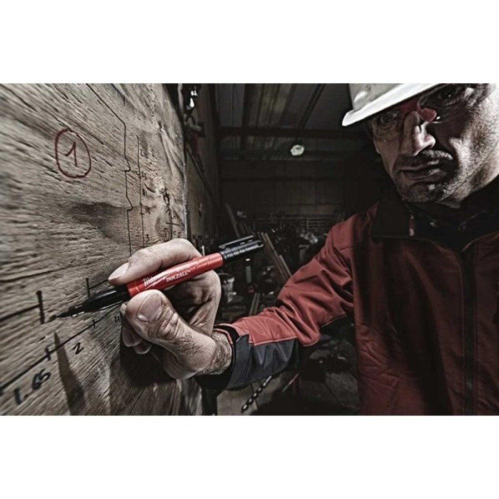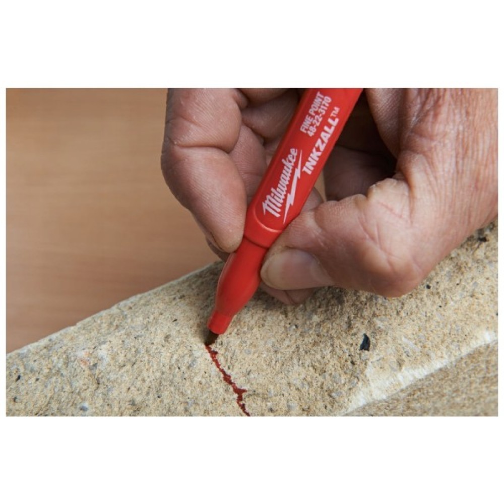 Маркер Milwaukee Inkzall залишається гострим, не плющиться і не згинається під тиском. Акрилове перо ідеально підходить для нерівних поверхонь, таких як ОСП та бетон. Маркер продовжує писати після 72 годин зберігання зі знятим ковпачком. Підходить для використання на бетоні, дереві, металі, фанері, ОСП, пластику. Може бути використаний на вологих, масляних, іржавих та зі сміттям поверхнях. Швидко сохне, що унеможливлює змащування мітки на металі та пластику. Тонкий корпус для використання у обмежених просторах. Кліпса на ковпачку дозволяє закріпити маркер на будівельній касці, штанах, куртці. Ковпачок легко відкривається однією рукою. Виступ на корпусі запобігає скоченню маркера з рівних поверхонь.