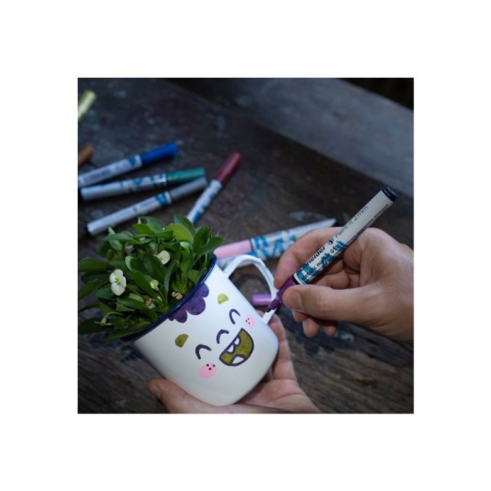 Набір металік маркерів для надзвичайних ефектів. Надає кожному проекту особливий вигляд. Ширина тонкої лінії прибл. 0,8 мм. Нова технологія пігменту забезпечує чисте та однорідне нанесення кольору. Алюмінієві лусочки, вкриті кольоровими пігментами, створюють сильний металевий ефект із надзвичайно високим рівнем блиску навіть при різному освітленні. Підходить для багатьох поверхонь. Чорнило, що швидко висихає, ідеально контролюється клапаном.