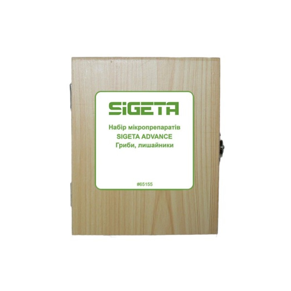 Набір мікропрепаратів Гриби лишайники прогресивної серії Sigeta Advance призначений для поглибленого вивчення відповідного розділу біології. Комплект вміщує 20 готових препаратів, 5 порожніх предметних і 5 покривних скел. Постачається в акуратному дерев'яному боксі на защіпці. Готові слайди ілюструють будову різних рослинних організмів, включно з мохами, водоростями, папороттю та вищими рослинами.