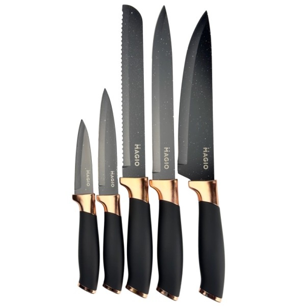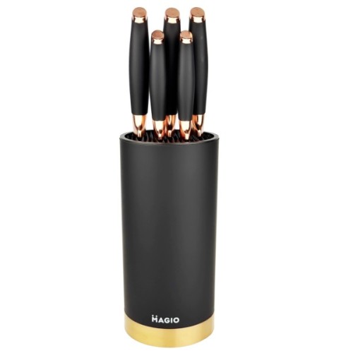 Magio MG-1091 - Набір ножів виготовлений з високоякісної нержавіючої сталі, яка довговічна та стійка до корозії. Леза ножів гострі та міцні, що забезпечує плавне та точне різання. В наборі йде підставка, яка робить набір зручним для зберігання та використання.