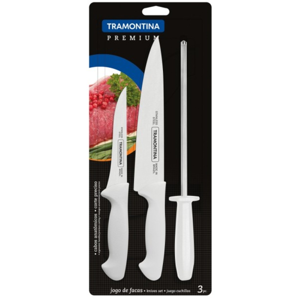 Ножі серії PREMIUM мають сучасний дизайн, а анатомічна поліпропіленова ручка має текстуру, що забезпечує комфорт і безпеку при роботі. Ідеальна V-подібна форма заточування леза гарантує точне акуратне нарізування, навіть після тривалого використання. Леза ножів виконані з нержавіючої сталі AISI 420 з товщиною 2 мм. Можна мити в посудомийній машині.