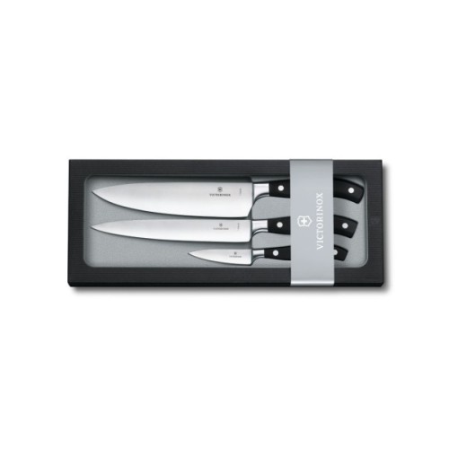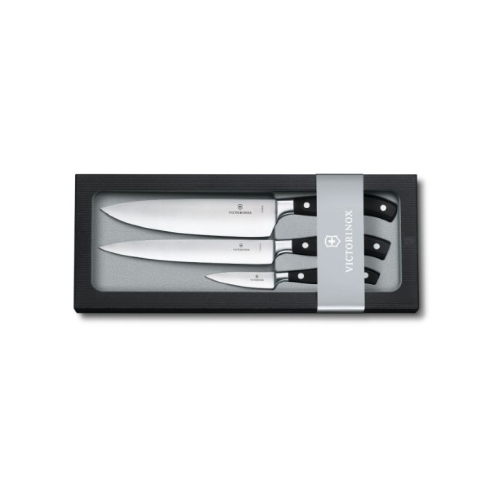Victorinox GRAND MAITRE Chef's Set - набір із 3-х кухонних ножів. Висококласні ковані ножі з елегантними чорними рукоятями від швейцарського виробника – компанії Victorinox (Вікторинокс). Багатофункціональний комплект для різноманітних кулінарних завдань.