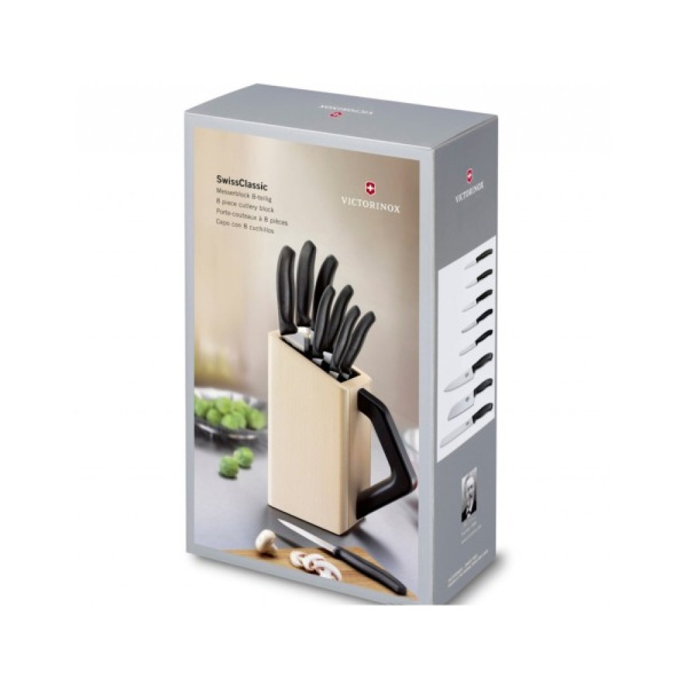 Victorinox Swiss Classic Cutlery Block - набір із 8 кухонних ножів з чорними рукоятками. Оригінальна букова підставка із наповнювачем-щетиною для довільного розміщення інструментів. Фірмова якість від швейцарської компанії Victorinox.