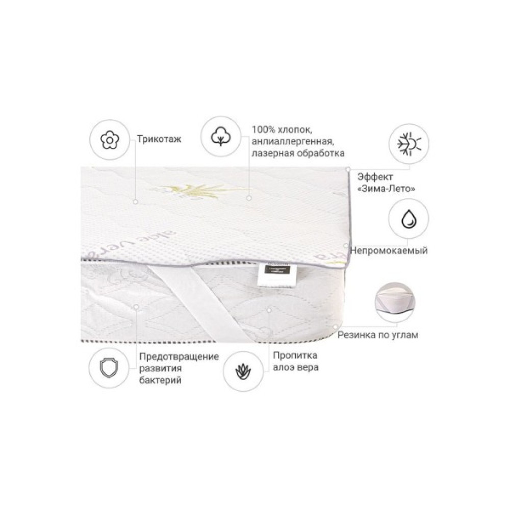 Завдяки просоченню алое вера наматрацник має вентилювальні, антибактеріальні, пом'якшувальні, регенерувальні та заспокійливі властивості, що створить комфортні умови для вашого сну.