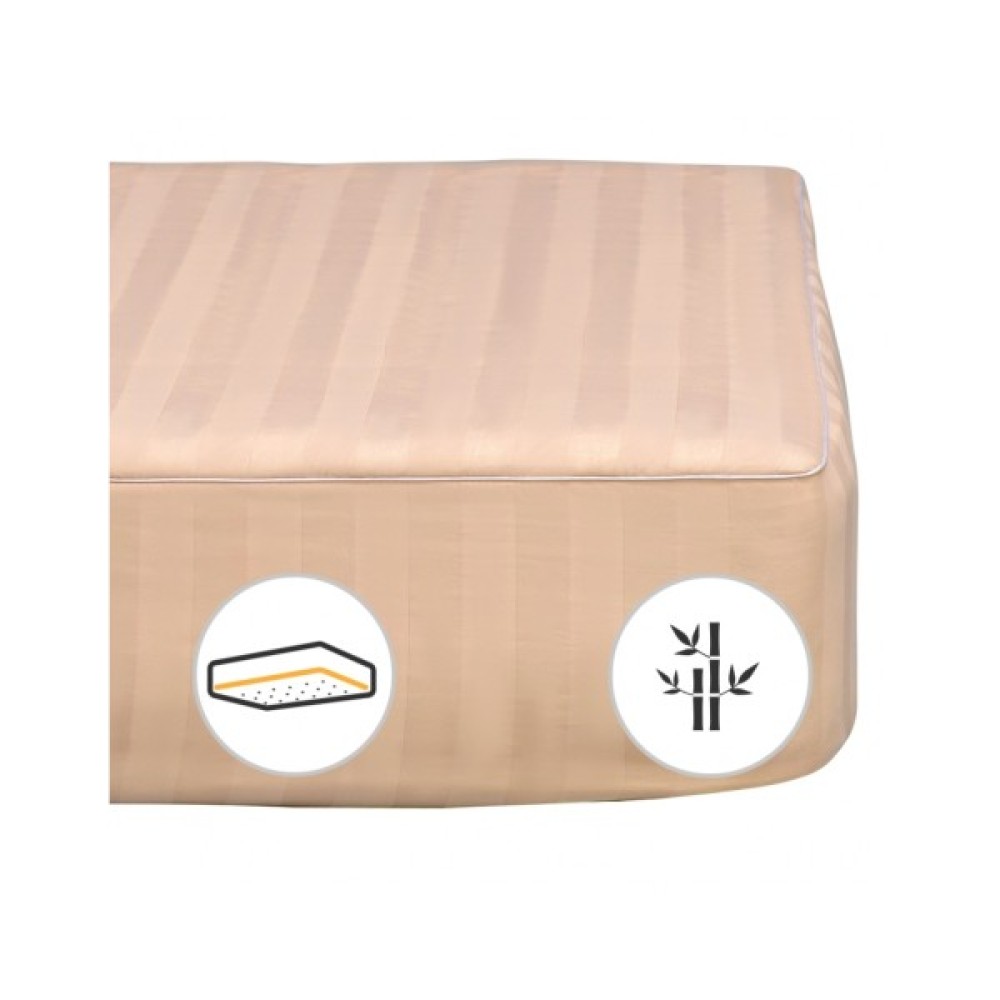 Наматрацник на гумці з високоякісної італійської тканини класу "Luxe". Тканина має назву "Сатин-страйп Італія", яка є довговічною, складається виключно зі 100% високоякісного бавовняного волокна. Сатинова тканина чохла має складне жакардове переплетення, що надає наматрацнику не тільки високоестетичної вишуканість, але й збільшує міцність тканини загалом. З іншого боку наматрацник виготовлений з італійського мікросатину, до складу якого входить бавовна та поліефірне волокно, яке надає наматрацнику легкості, довговічності.