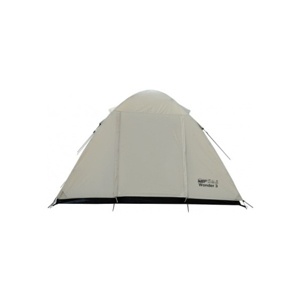 Особливості намету Tramp Wonder 3:- Двошаровий намет - складається з тенту (зовнішня частина намету) і внутрішнього намету (спальне місце). - Каркасна конструкція - міцна, що в свою чергу дозволяє уникнути таких проблем, як перекіс і деформації в процесі експлуатації.- Матеріал каркаса фіберглас - пластичний матеріал, що складається з скловолокнистого наповнювача, скріпленого синтетичною смолою, який характеризується міцністю і легкістю.- Можливість підняти двері і утворити тент при вході.- Намет має 2 вентиляційних клапана.- Всі шви намету проклеєні і герметизовані за допомогою термозбіжної водонепроникної стрічки. - Вхід в спальне відділення продубльований москітною сіткою, яка служить, як захист від комах і в якості додаткової вентиляції.