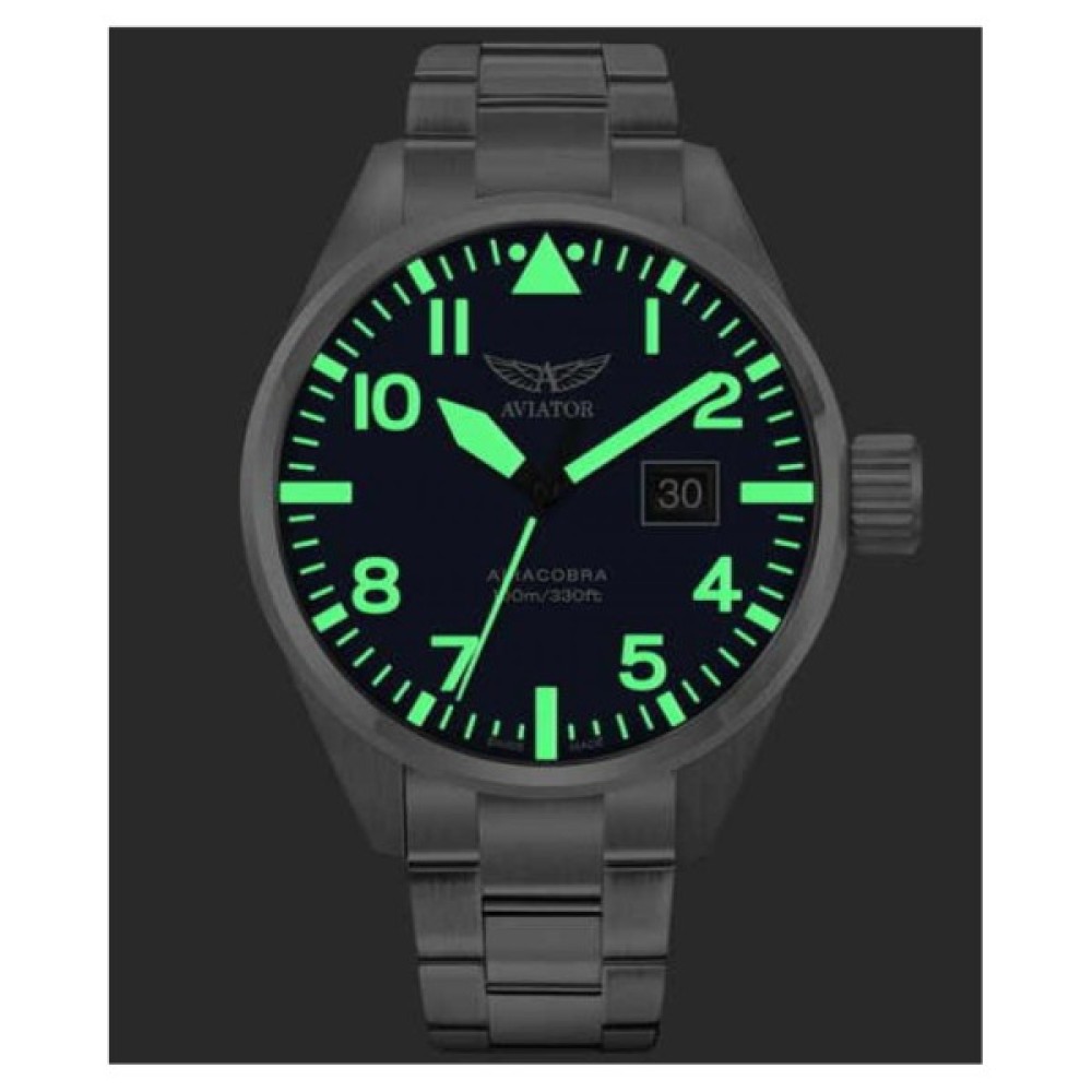 Своєю матовою зернистою обробкою циферблат годинника нагадує прилади з кабіни пілота. Лаконічні, висококонтрастні стрілки і годинникові мітки забезпечують чудову чіткість і читання зображення, а збільшене вікно індикації дати в районі тригодинної позначки ще більше посилюють схожість моделі з авіаційним приладом. Як і у всіх інших годинниках AVIATOR всі деталі цієї моделі ретельно продумані, надаючи їй навіяний авіацією оригінального вигляду.