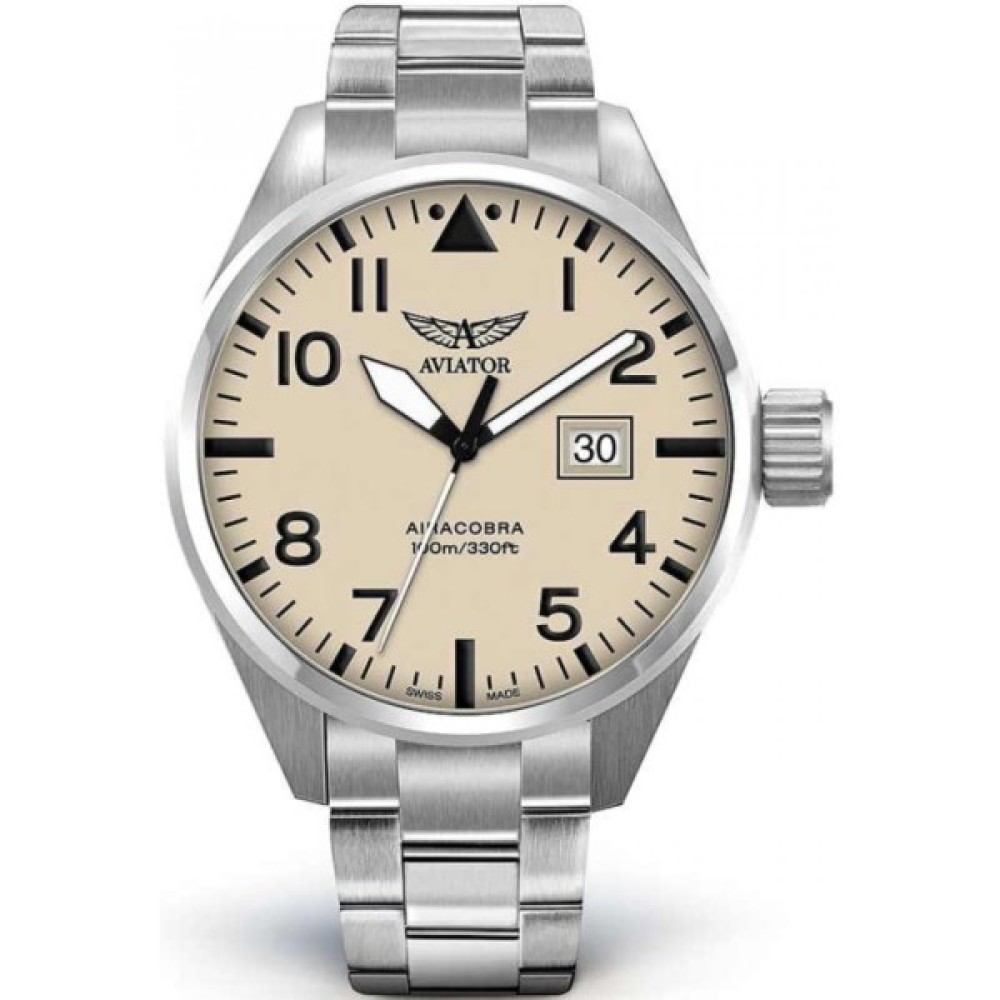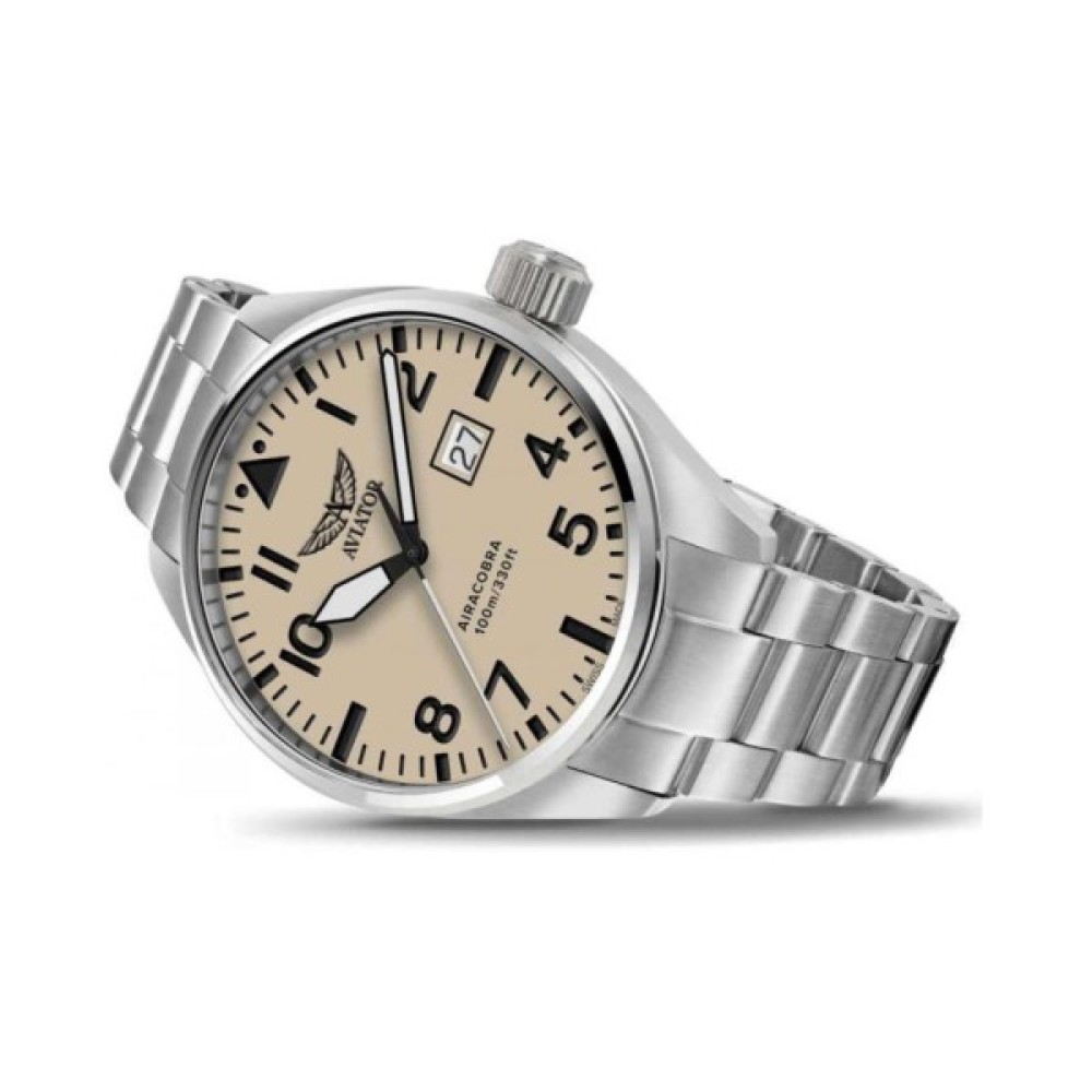 Під час Другої світової війни забезпечення авіаційної підтримки літаками Airacobra було запорукою успіху сухопутних операцій. Годинник AVIATOR Airacobra P42 не поступається своєму авіаційному прототипу за надійністю і витриманий у такому ж ретро стилі, як і легендарний військовий літак. При створенні AVIATOR Airacobra P42 використовуються найкращі та найпрестижніші матеріали, що забезпечує годинникам військову точність і класичний вигляд. Своєю високою контрастністю стрілки та годинникові мітки нагадують оформлення кабіни пілота. У годинника добре читається циферблат, велике вікно індикації дати і кришка корпусу з клепаними елементами. Все це надає годинникам Airacobra P42 виняткову надійність і в той же час дозволяє увічнити в них пам'ять про віхи в історії авіації.